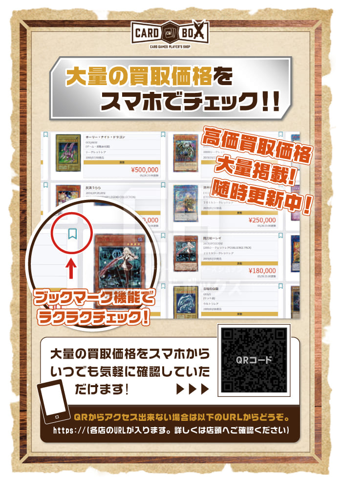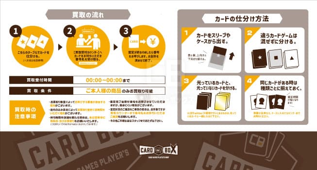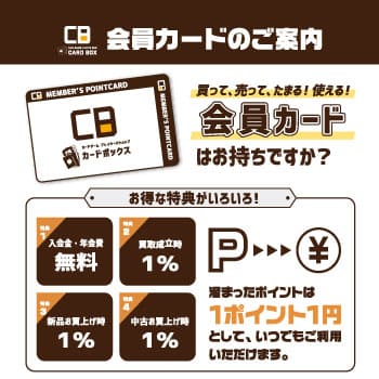 はじめてカードボックスへお越しいただく方にも安心・快適に楽しんでいただけるよう、店内で掲示している案内POPを元に各種ご利用案内をわかりやすく解説します。こちらではトレカの売買方法や大会イベント、会員カードのご案内などをカテゴリ別に掲載。気になる情報はこちらで事前にご確認いただき、当店でのさらに充実した時間をお過ごしください!