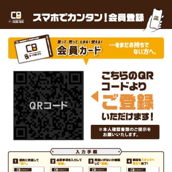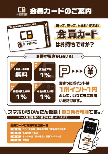即日発行可能なカードボックス会員カードは、作成するとお得な特典がいろいろ付いてきます。