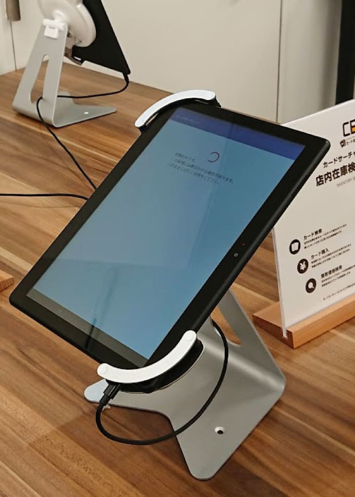 ①店内設置のカード検索タブレット「カードサーチャー」で欲しいカードを探します。