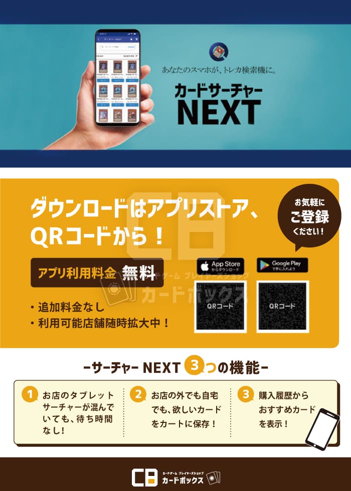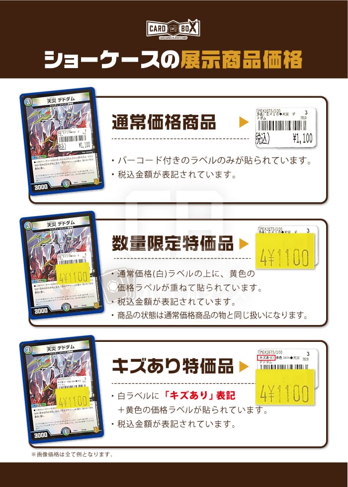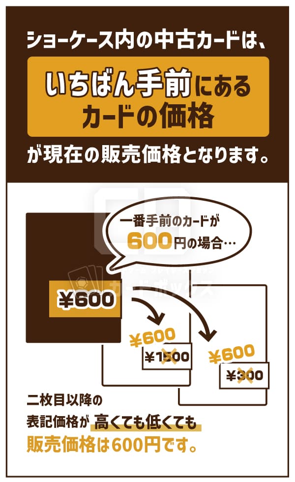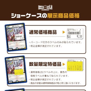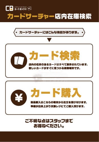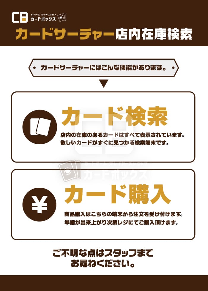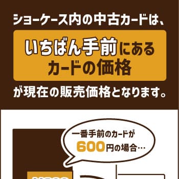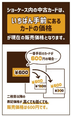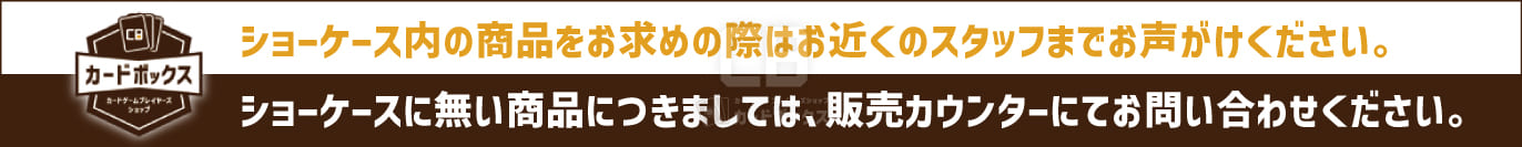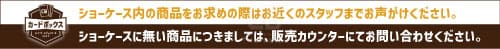 またショーケースに無い商品でも店内在庫がある場合もありますので、レジにてお問合せ、または店内に設置している検索システム「カードサーチャー」をご利用ください。