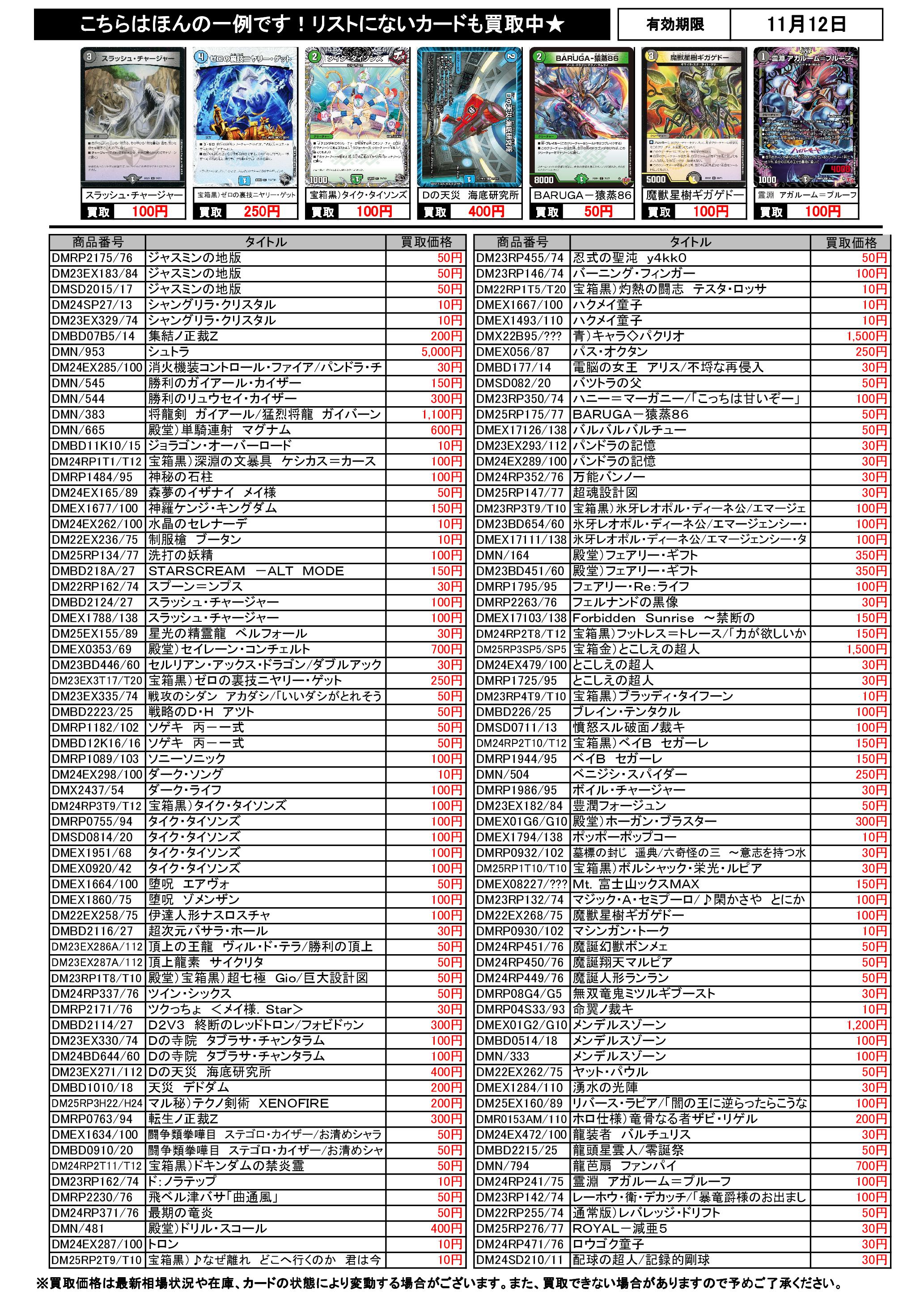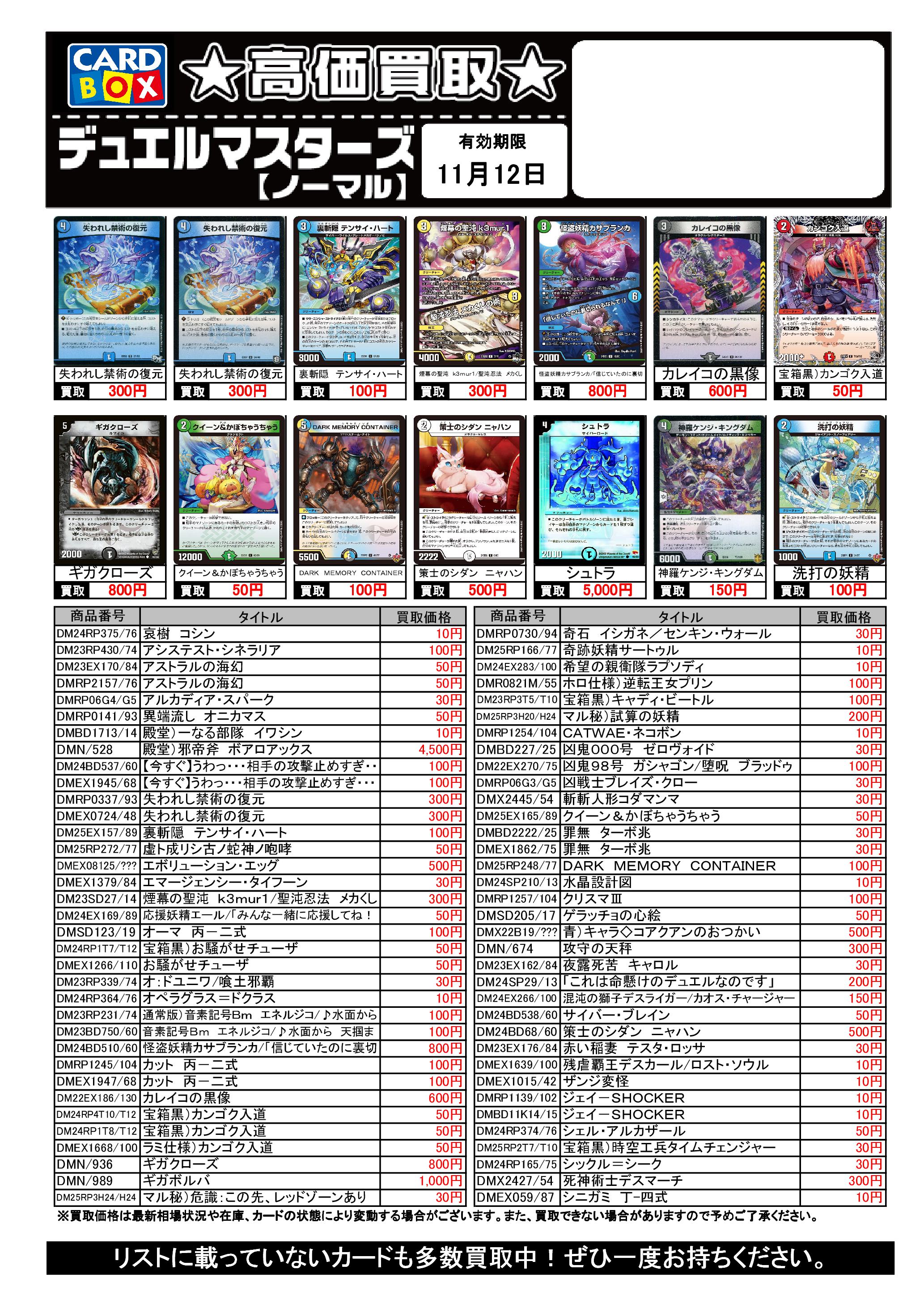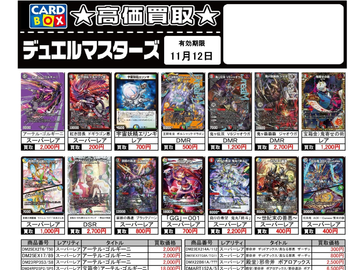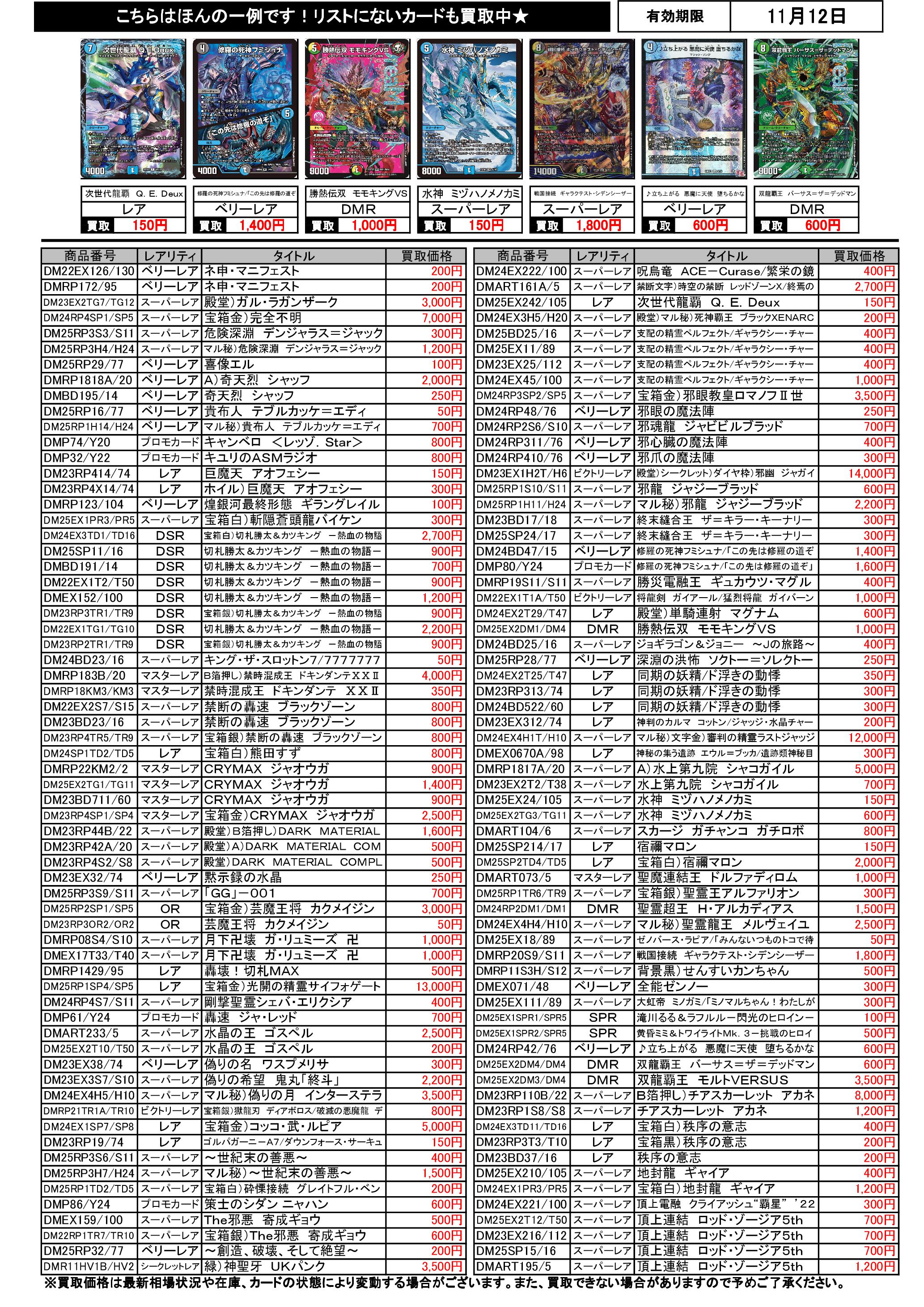 ※こちらの買取表は買取価格を保証するものではありません。カードの在庫枚数や状態によって価格が変動する場合がございます。また、表に掲載の30,000円を超えるカードにつきましては買取しておりません。