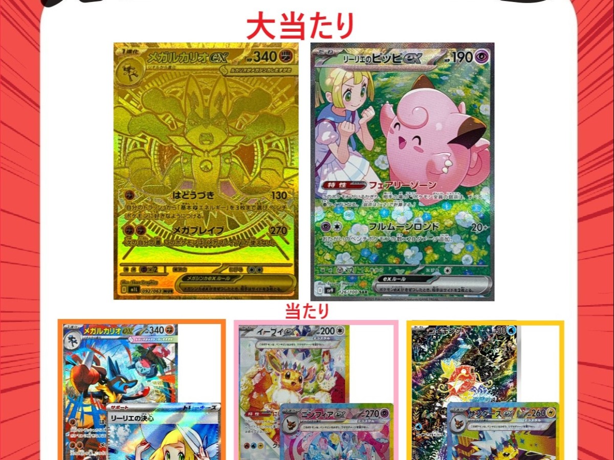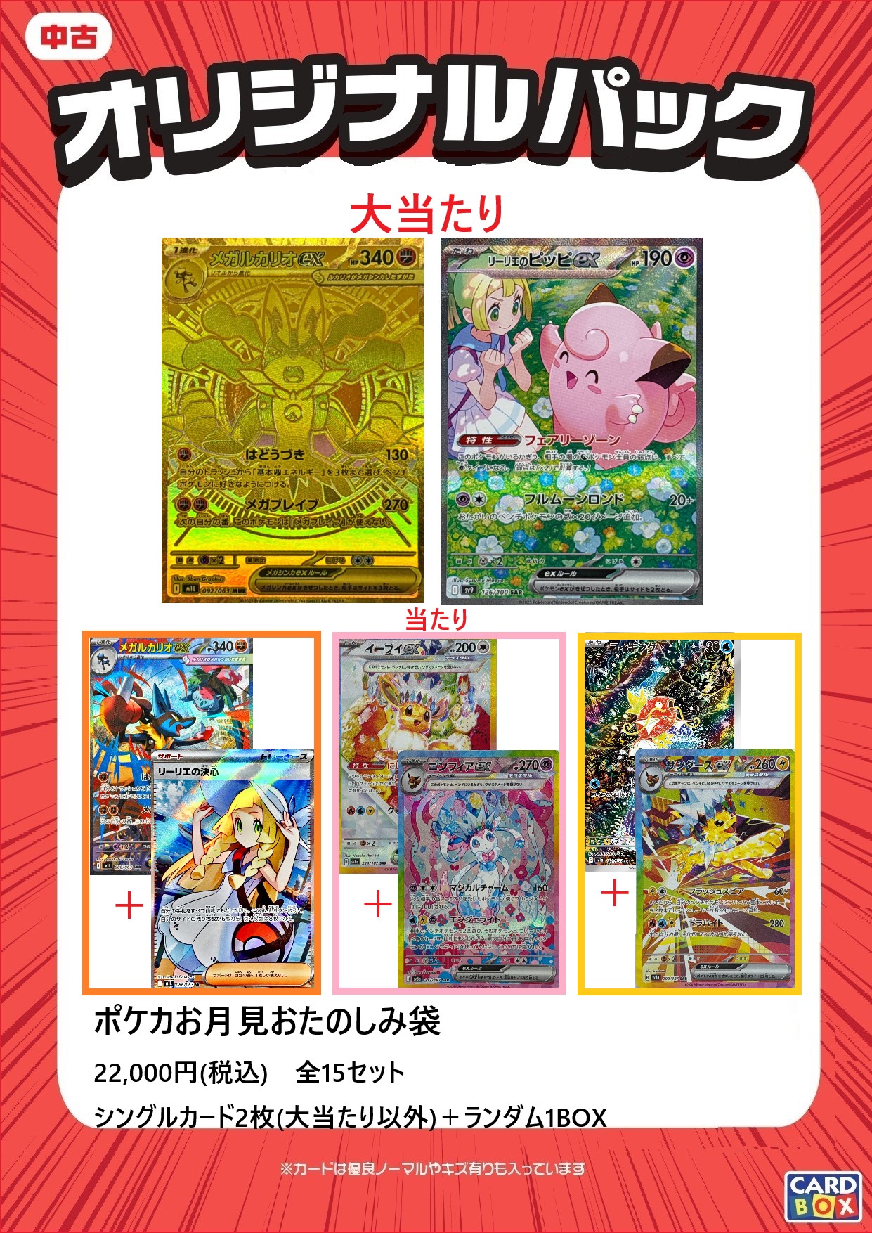大当たりのカード2点以外はシングルカードが2枚セットで全てに下記のポケカBOXがいずれか1BOX入っています。