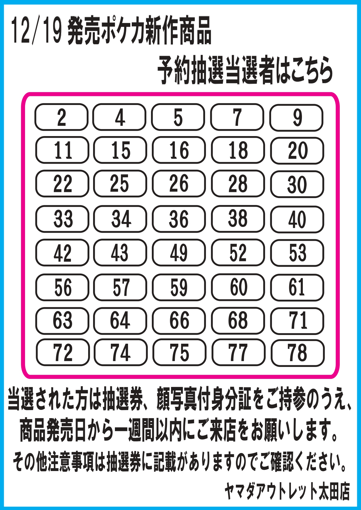当選者の方は抽選券控えをお持ちになり商品発売日より一週間以内に来店・引き取りをお願いいたします。