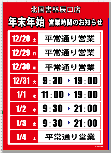 年末年始の営業時間につきましては、下記通りとなります。