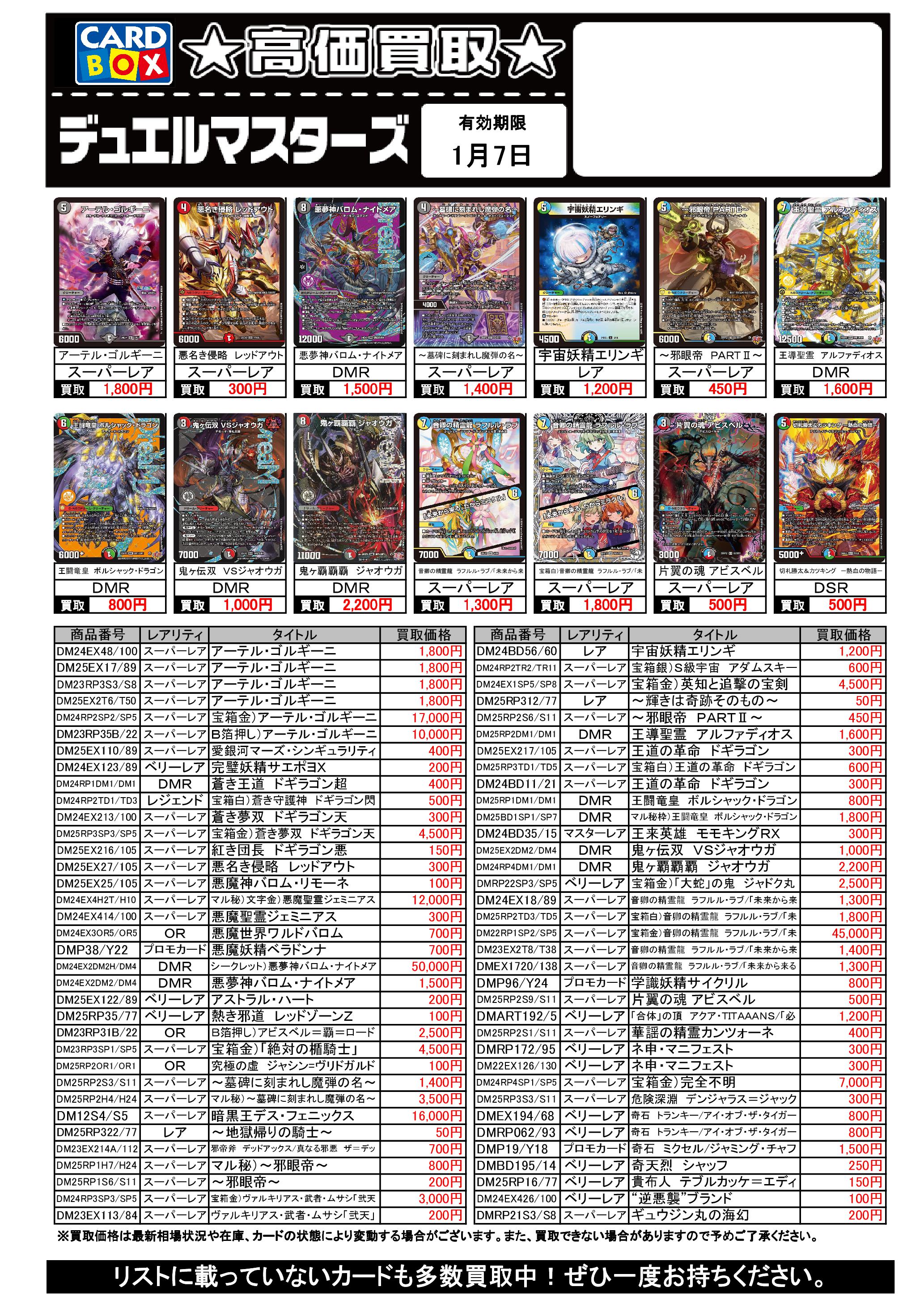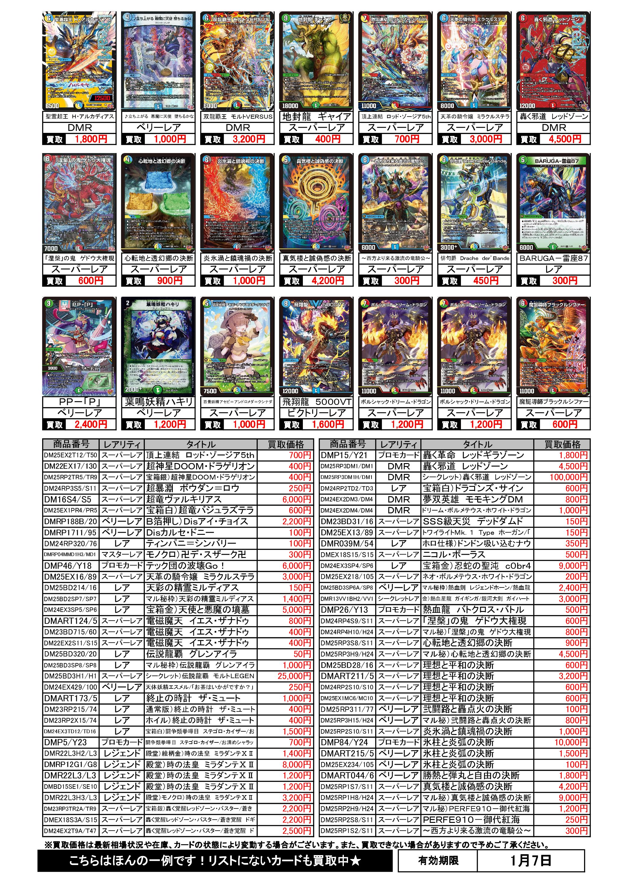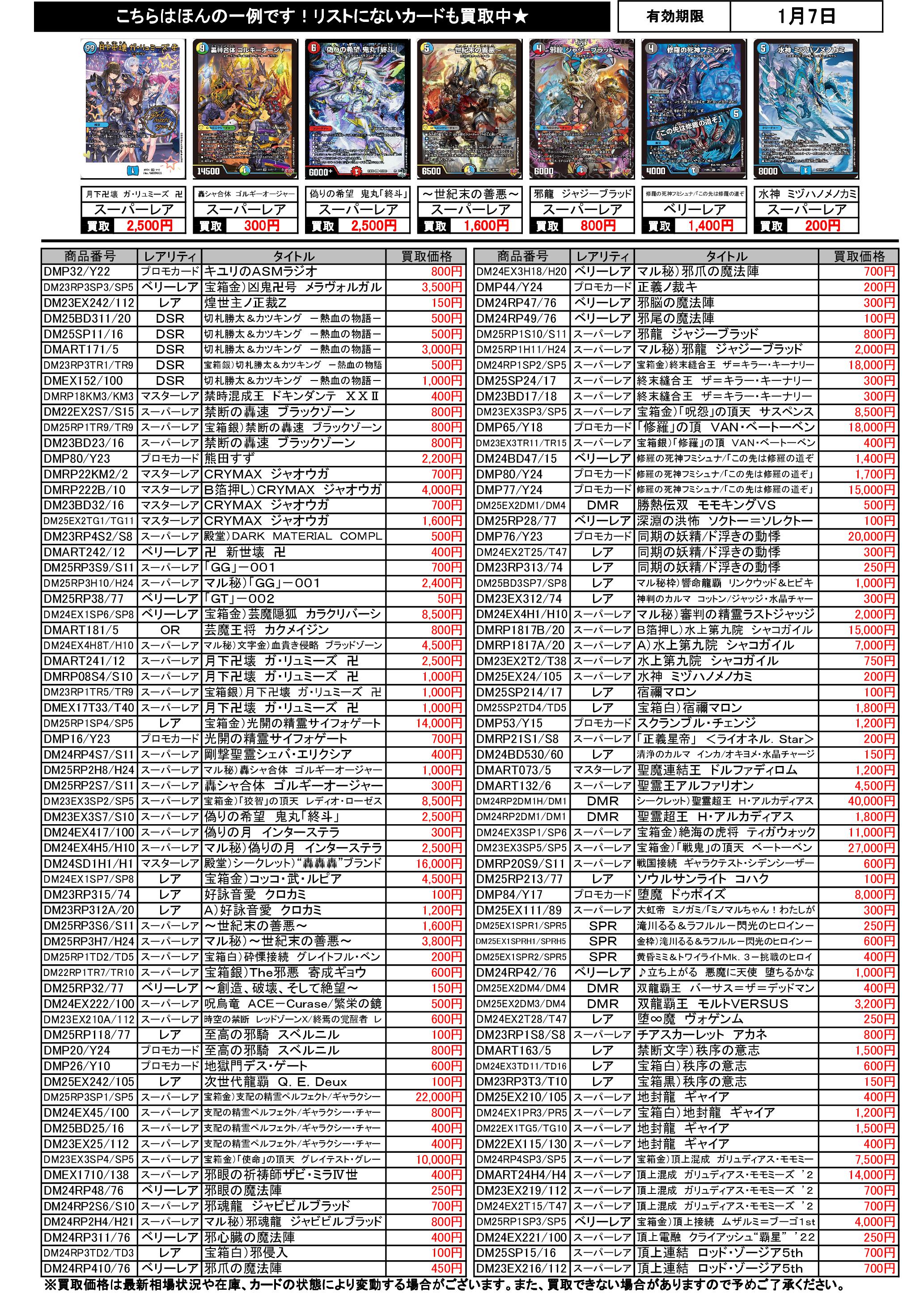※こちらの買取表は買取価格を保証するものではありません。カードの在庫枚数や状態によって価格が変動する場合がございます。また、表に掲載の30,000円を超えるカードにつきましては買取しておりません。