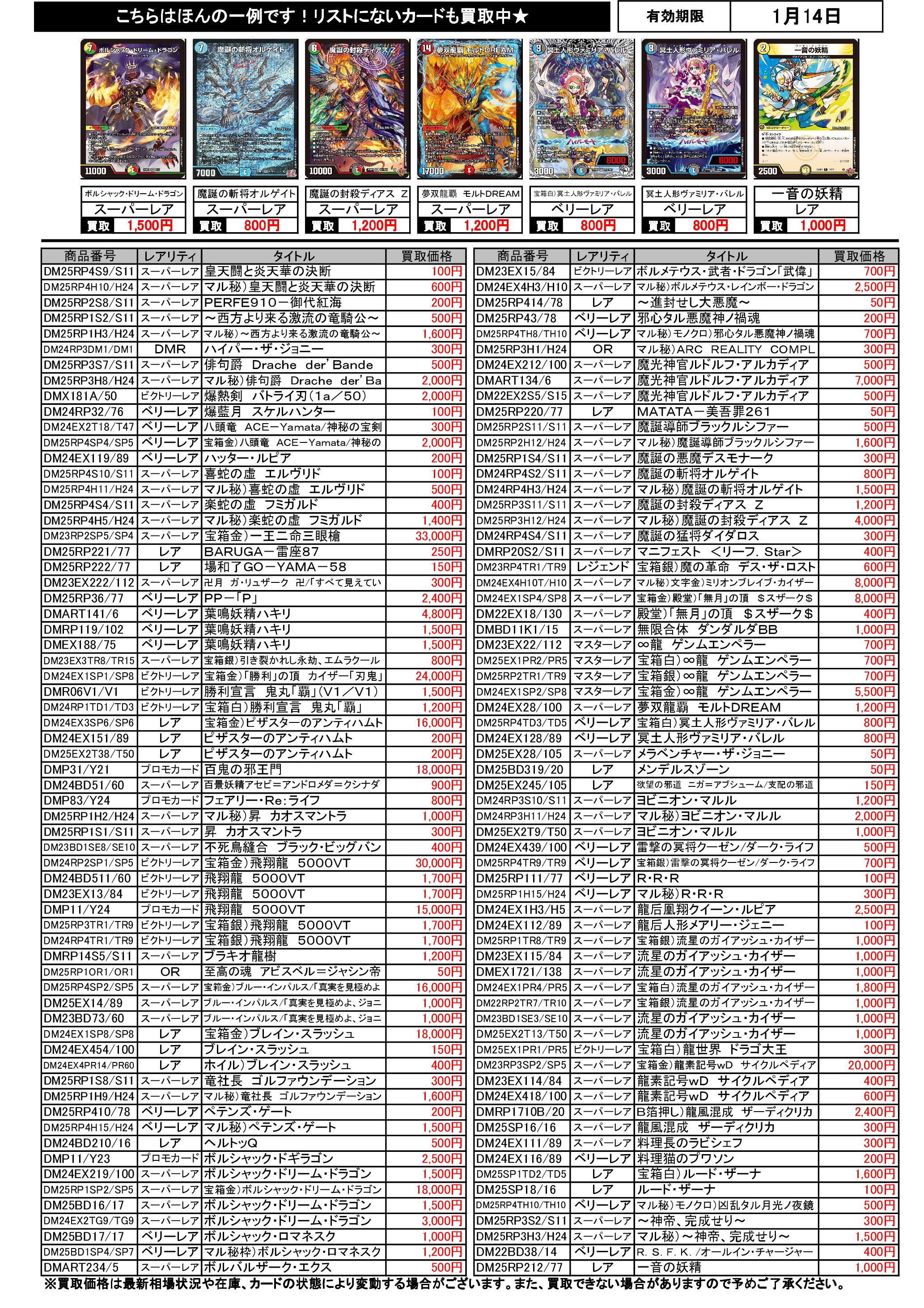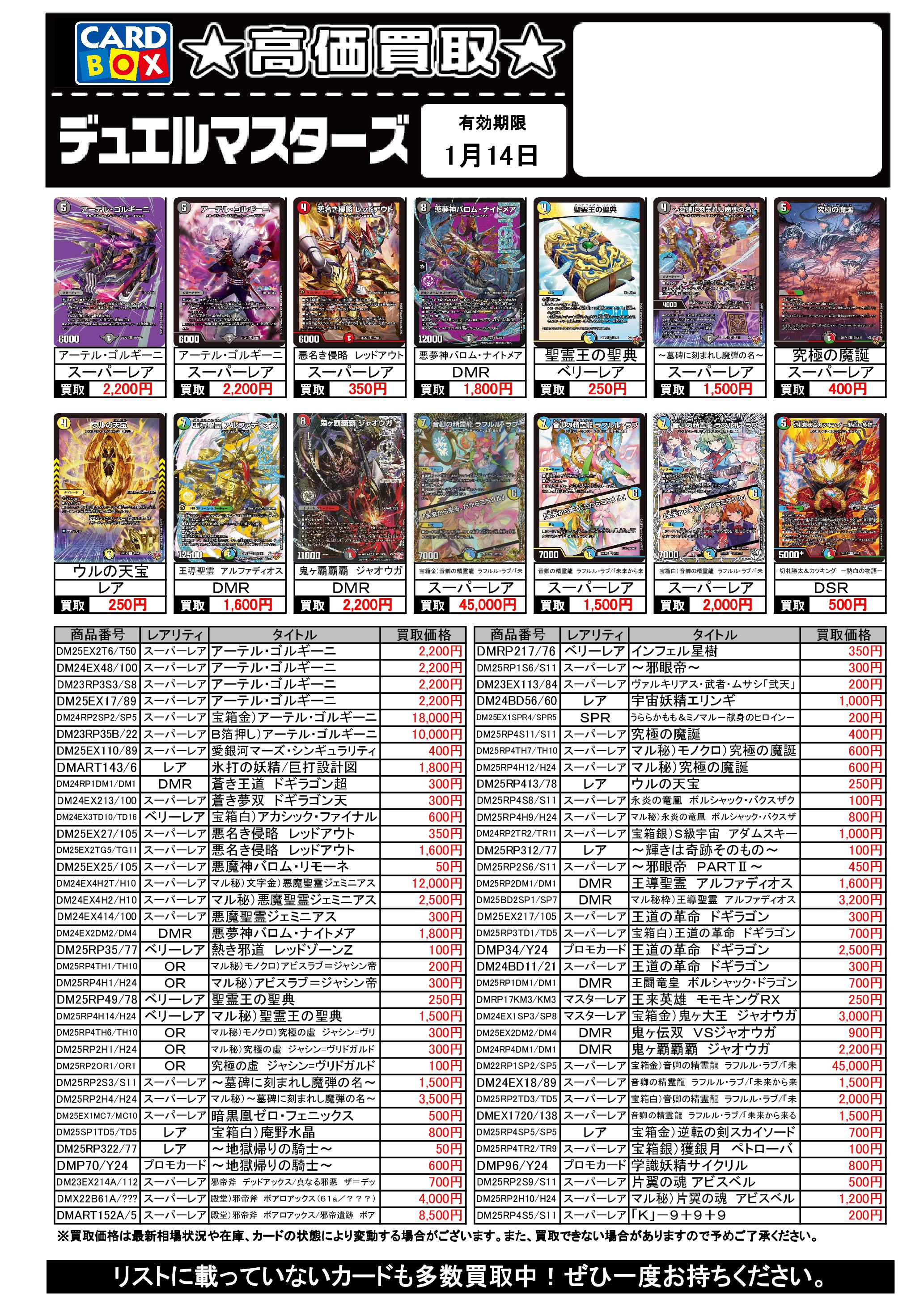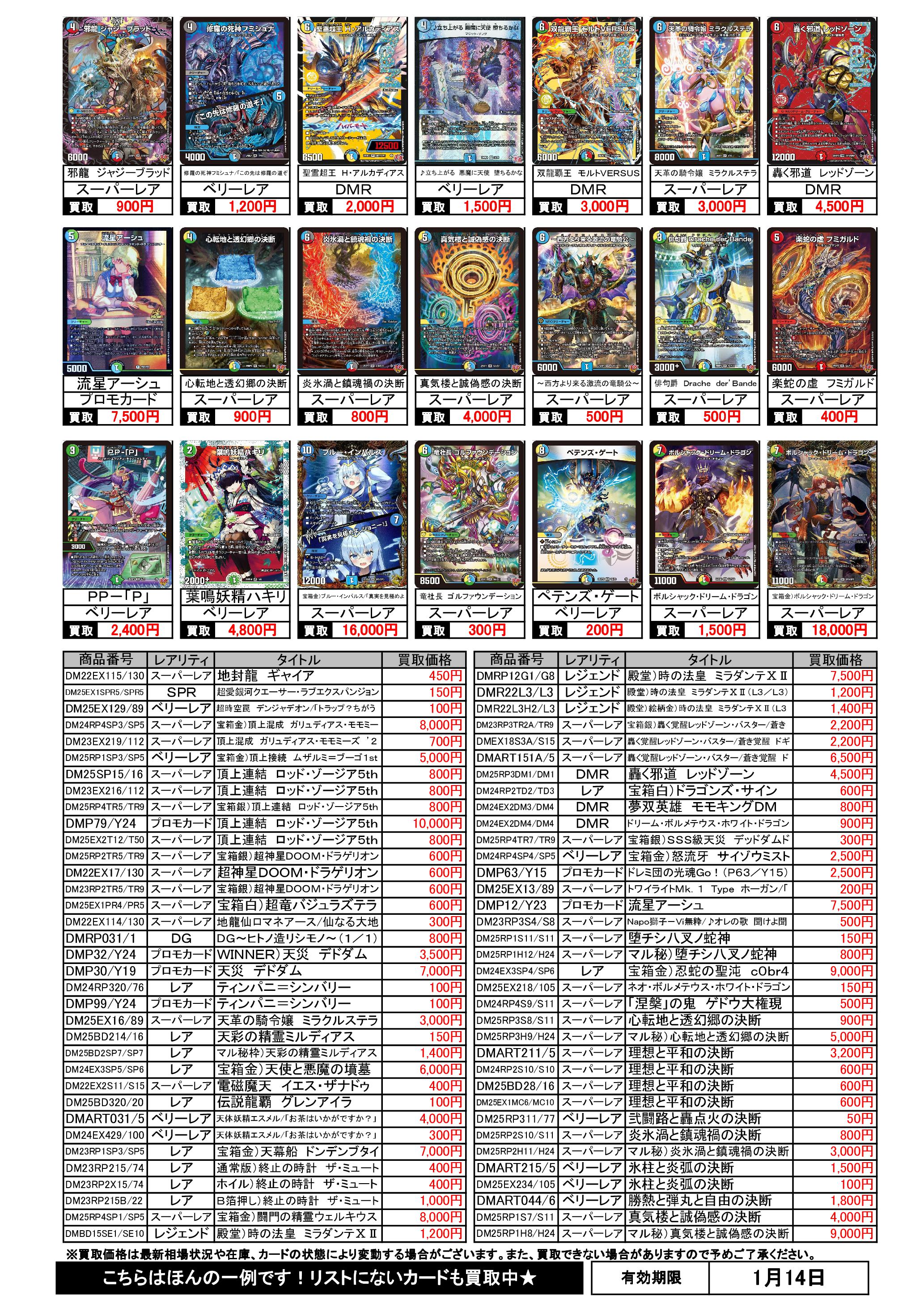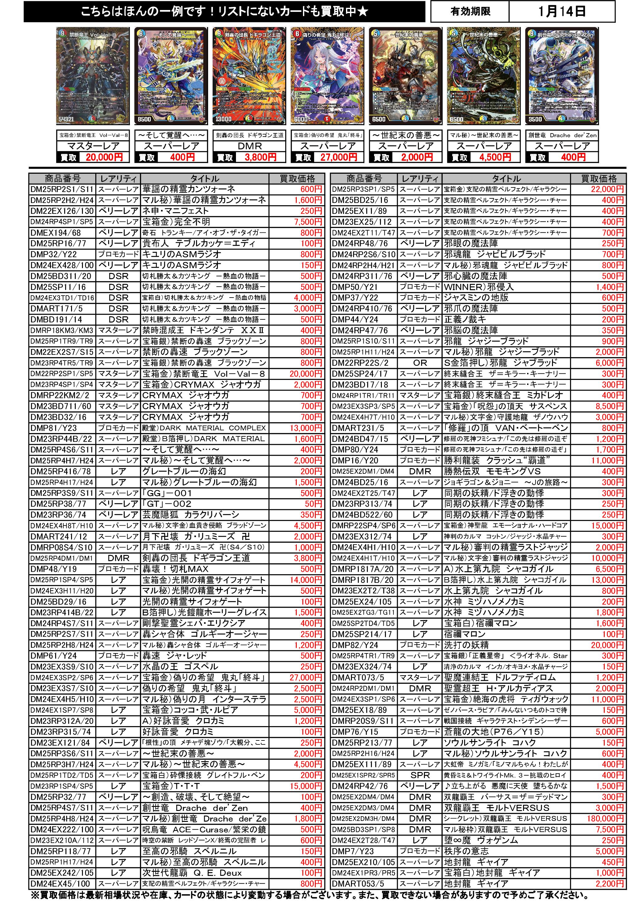 ※こちらの買取表は買取価格を保証するものではありません。カードの在庫枚数や状態によって価格が変動する場合がございます。また、表に掲載の30,000円を超えるカードにつきましては買取しておりません。