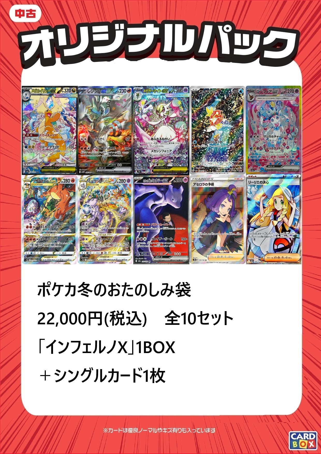 今回は「インフェルノX」が1BOXと画像のシングルカード1枚が入って税込価格22,000円の全10セットとなります。