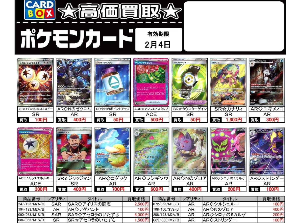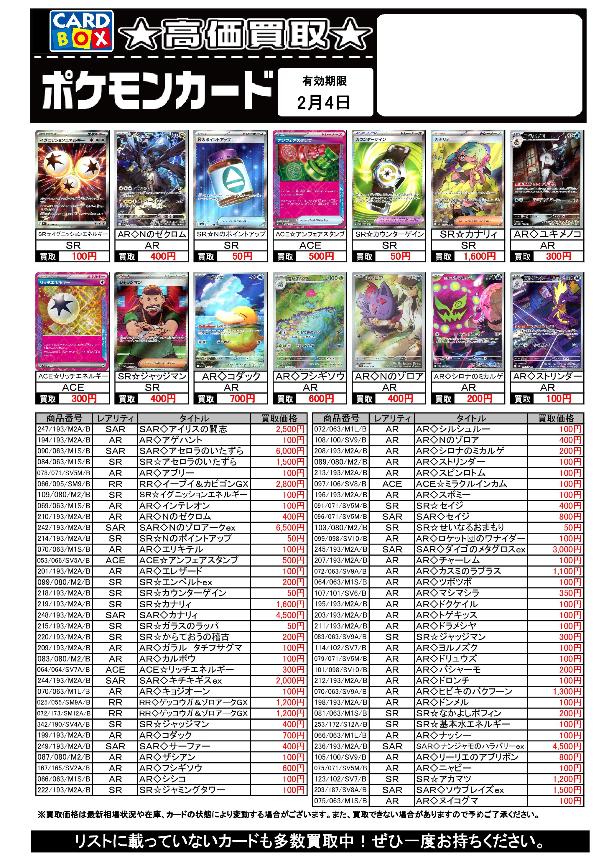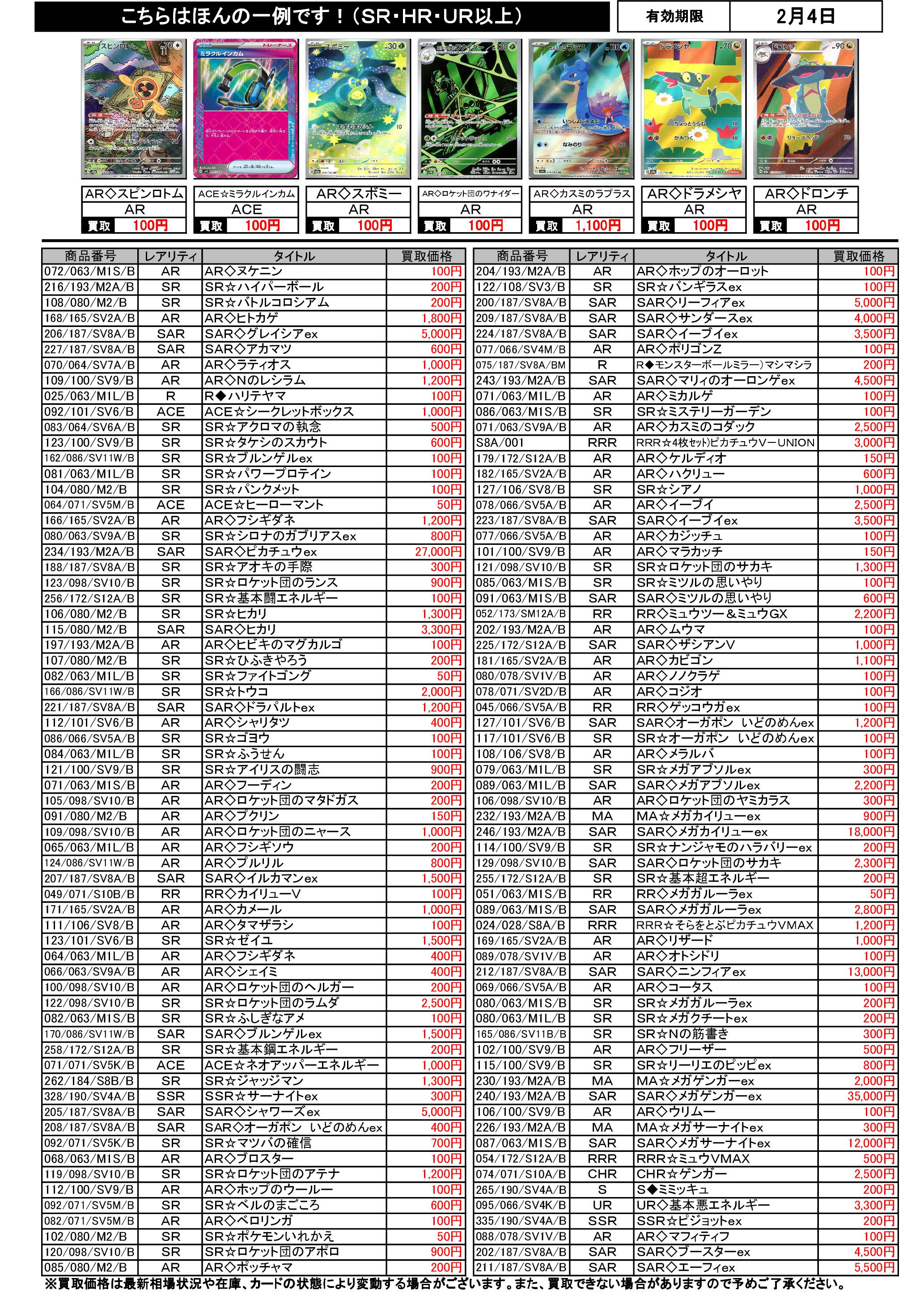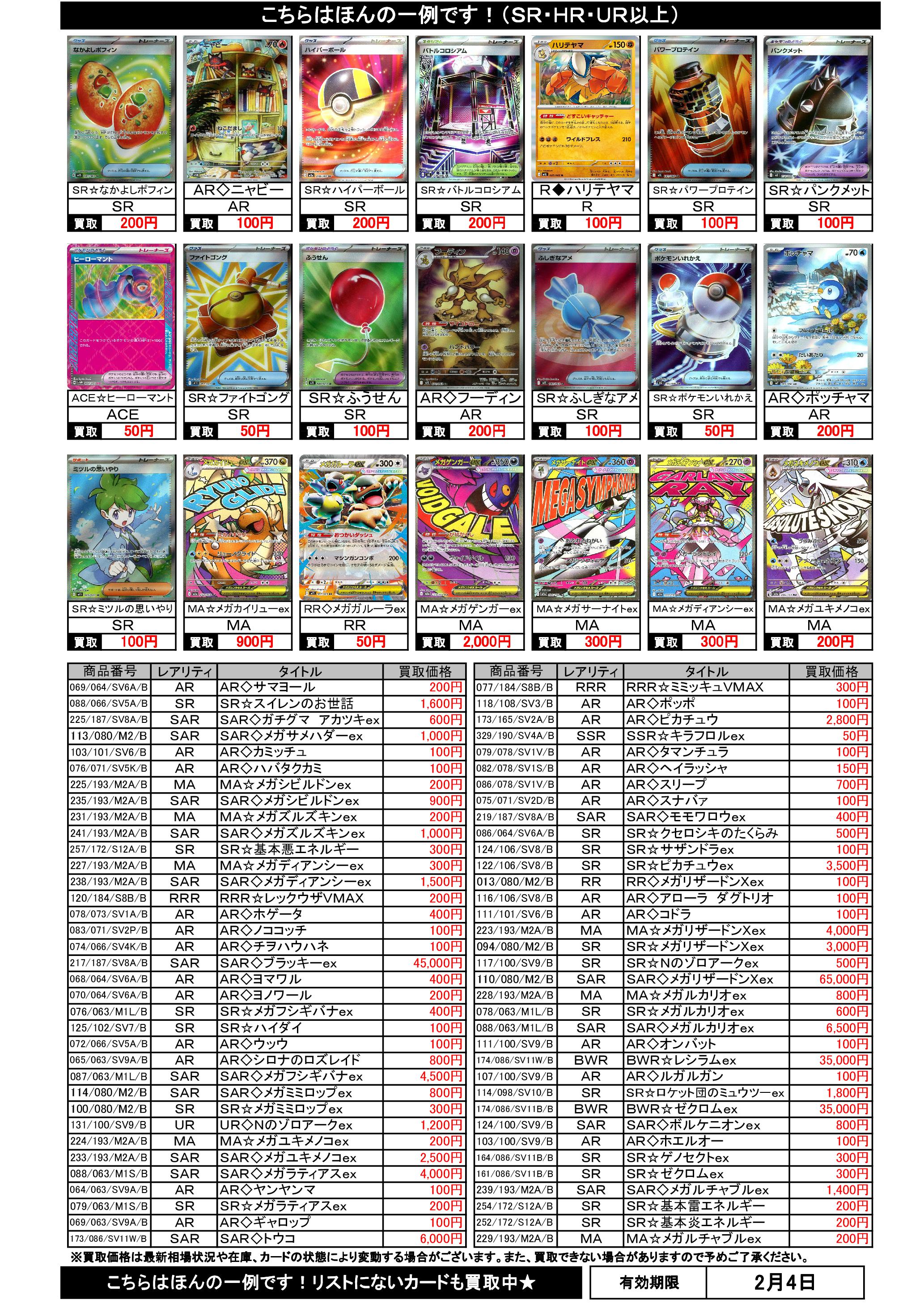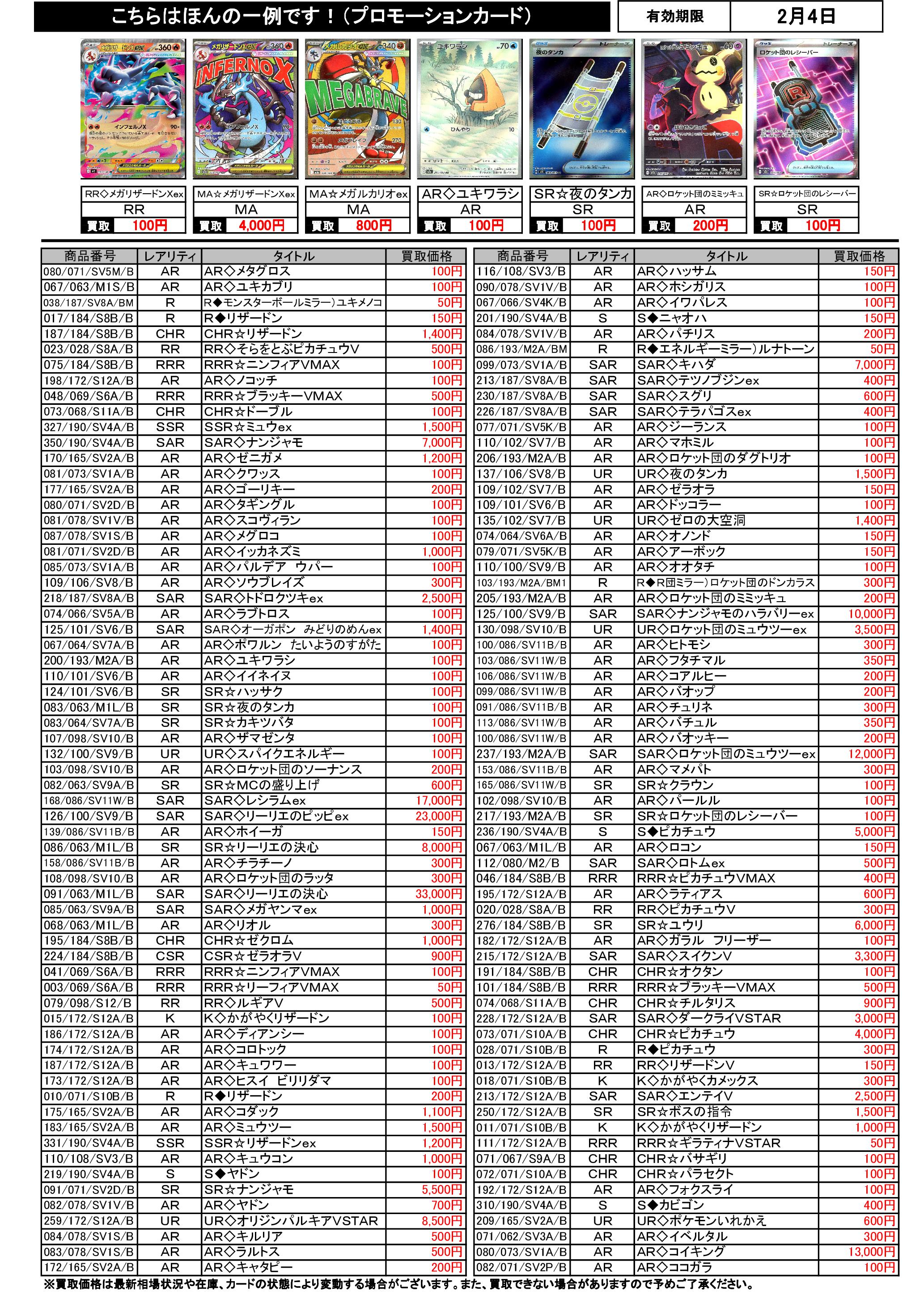 1/29~2/4のポケカ買取表です。