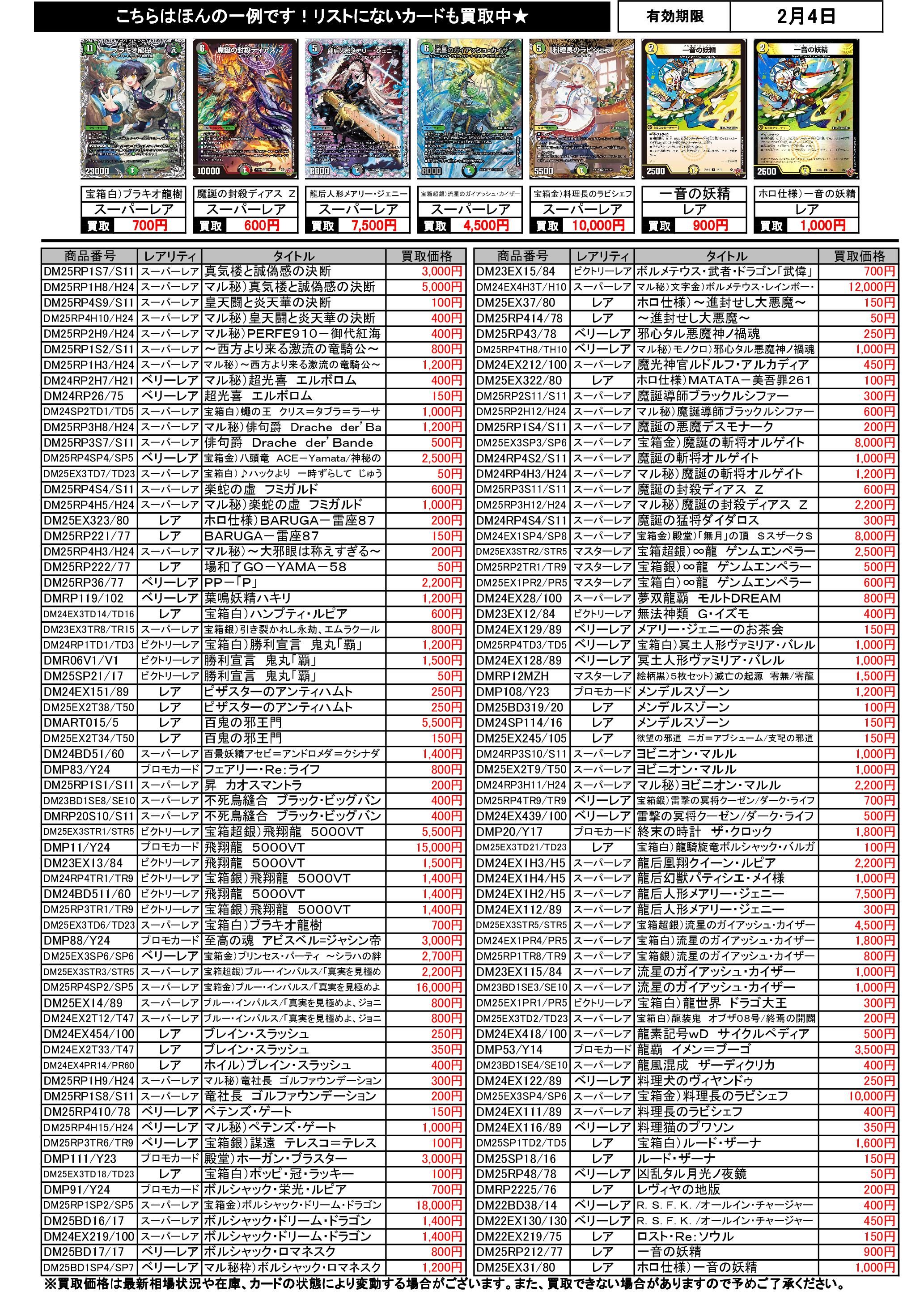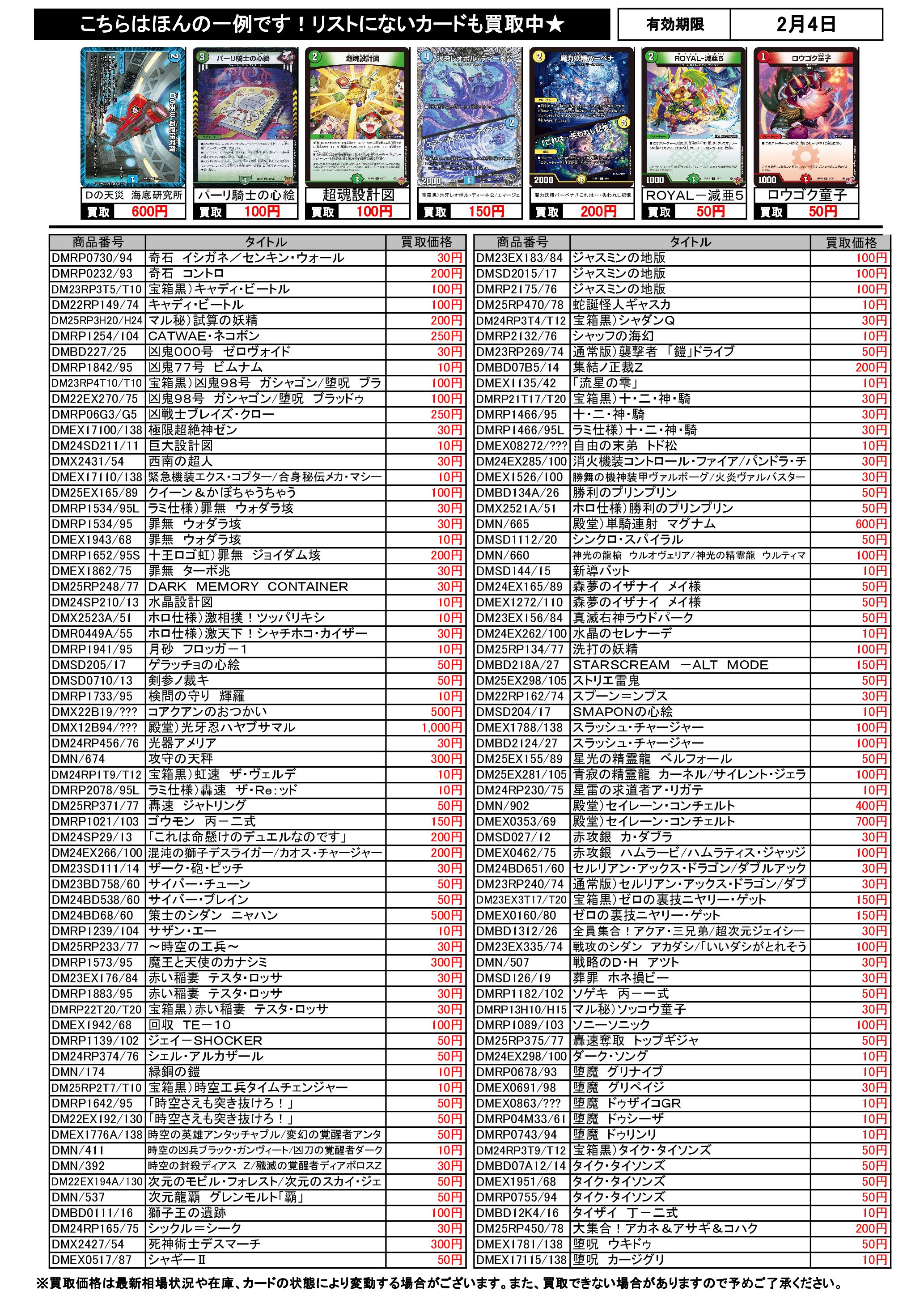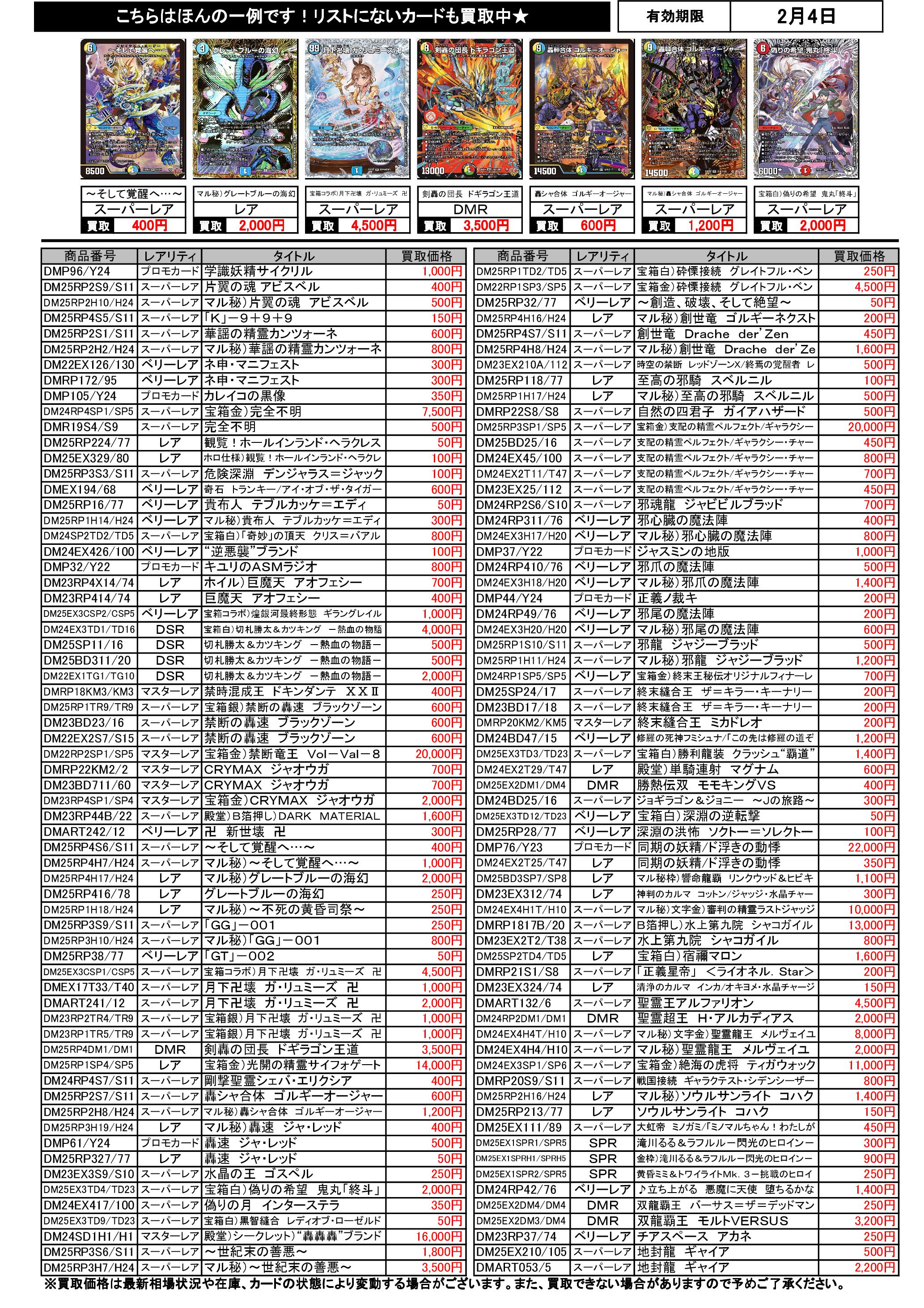 2/1~2/4のデュエマ買取表です。