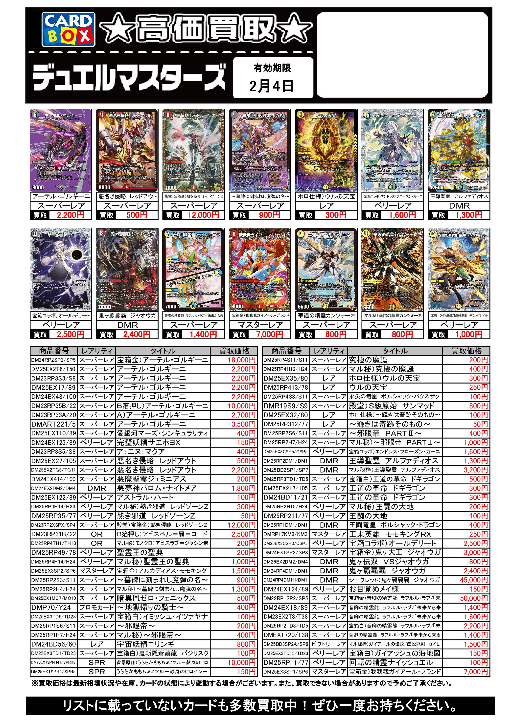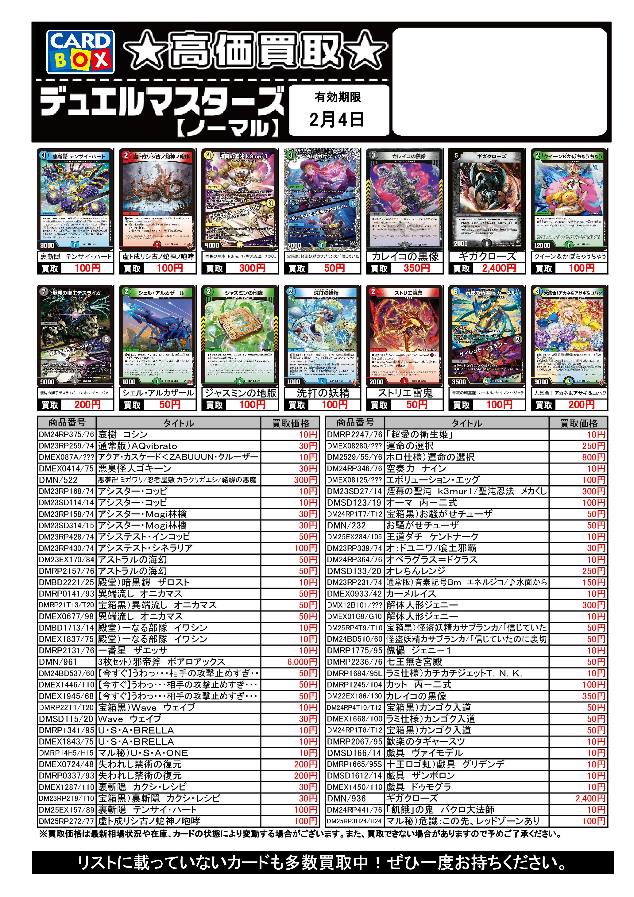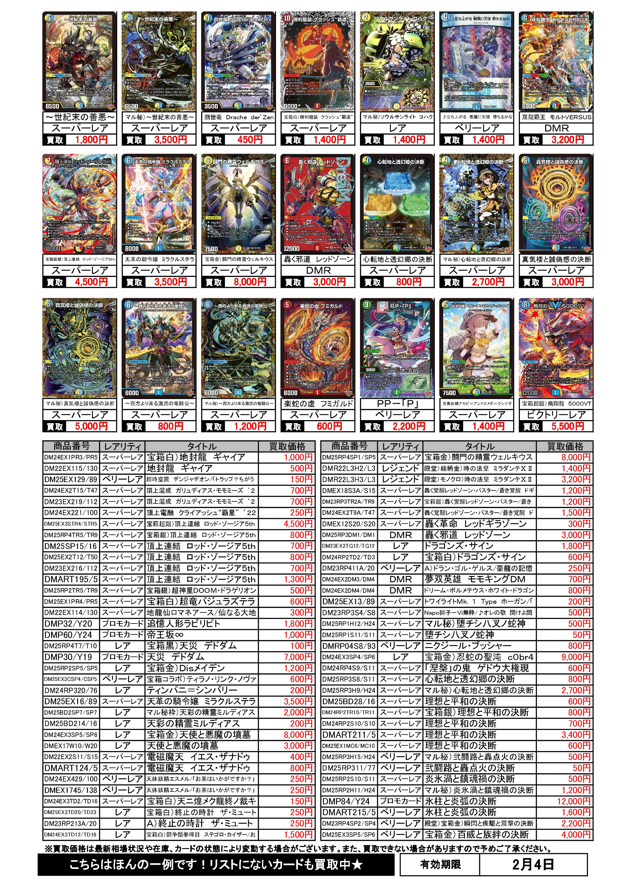 2/1~2/4のデュエマ買取表です。