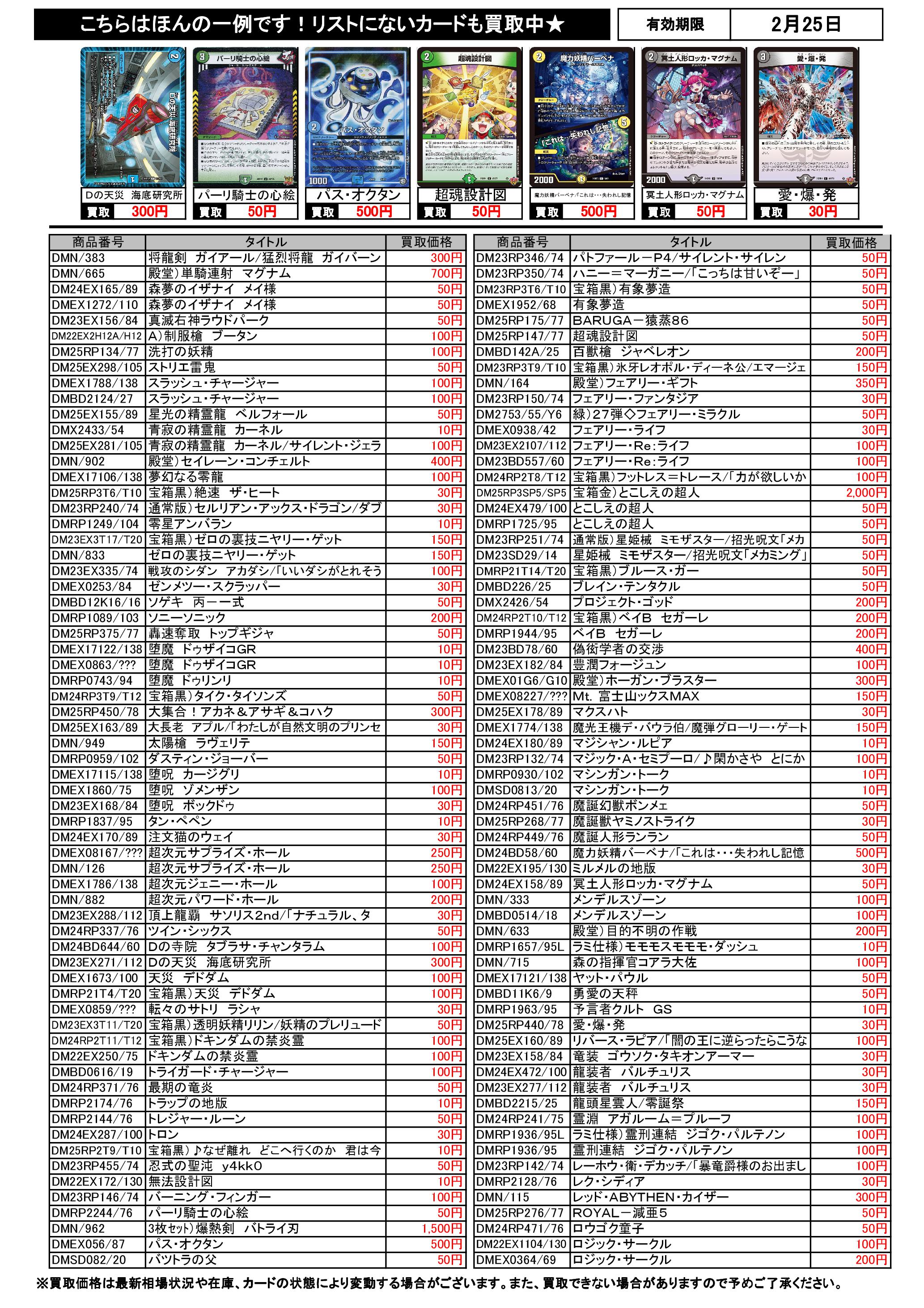 2/19~2/25のデュエマ買取表です。