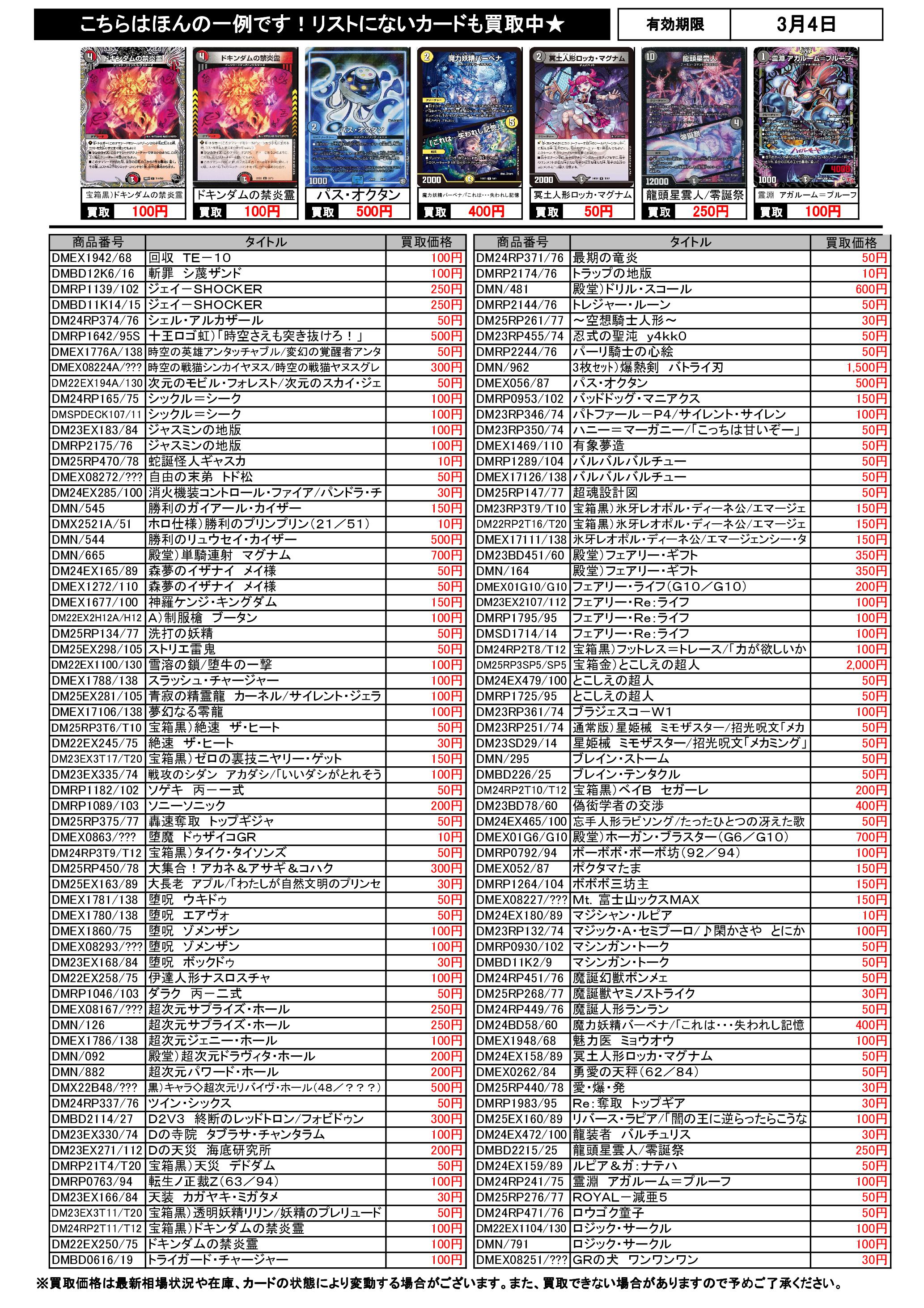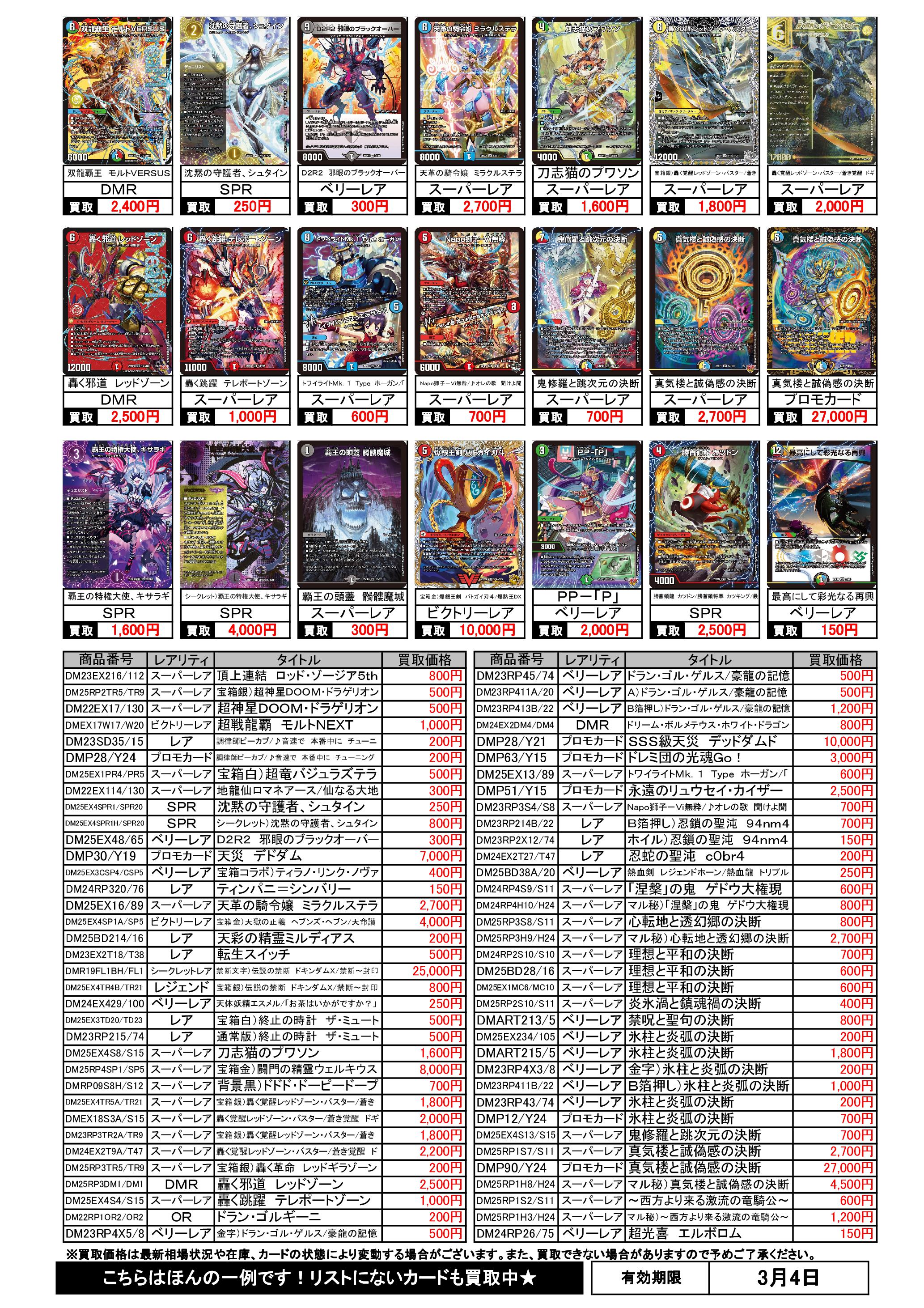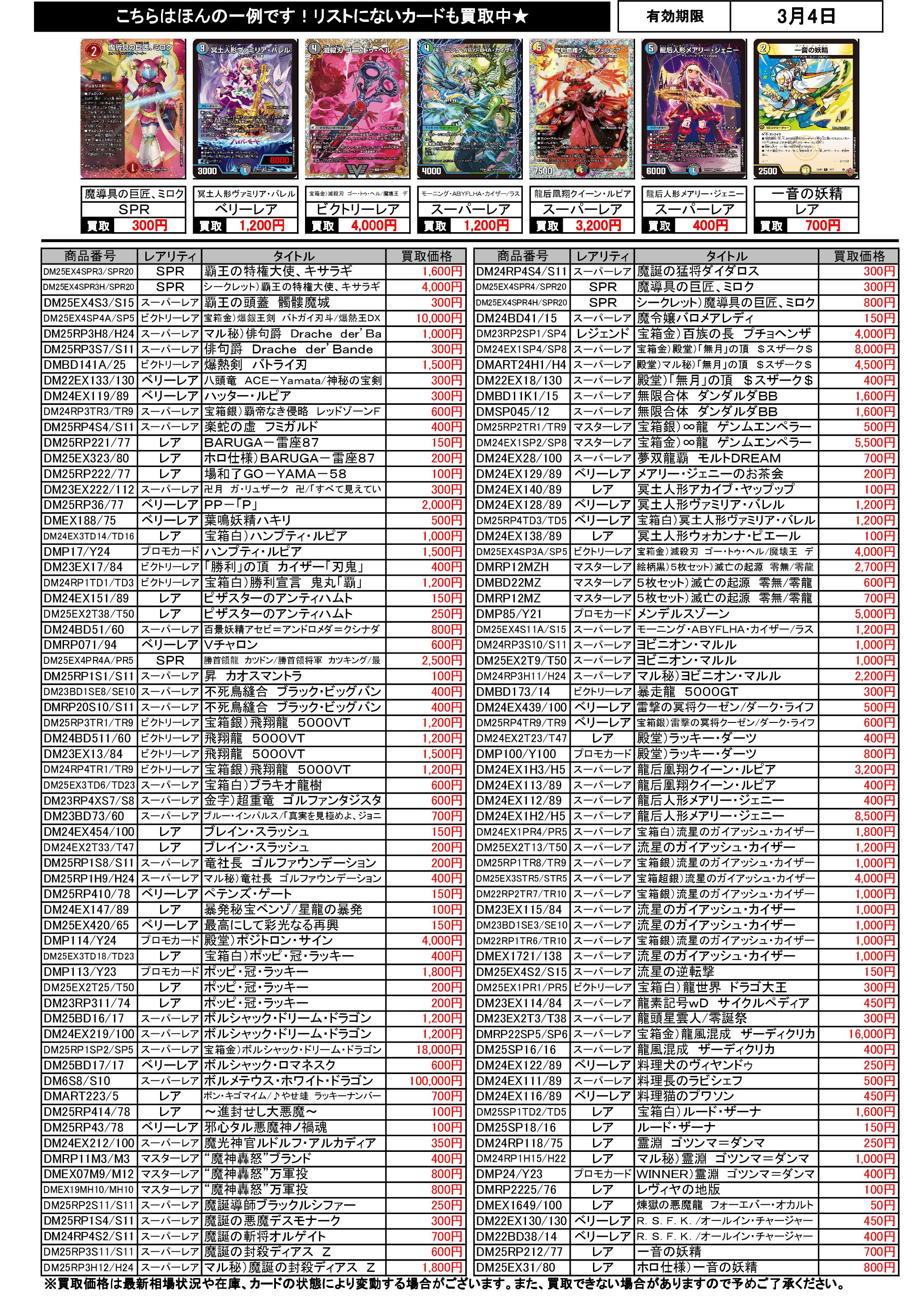 3/1~3/4のデュエマ買取表です