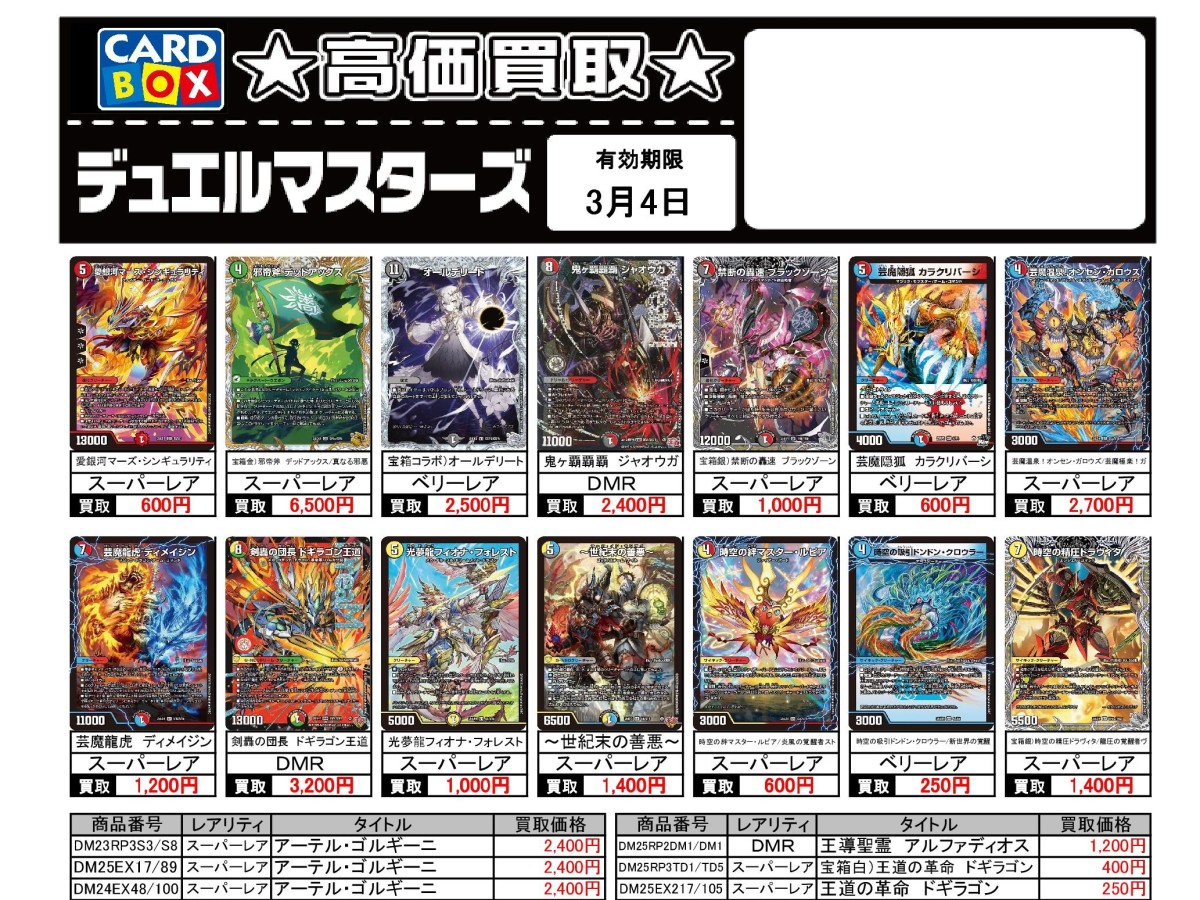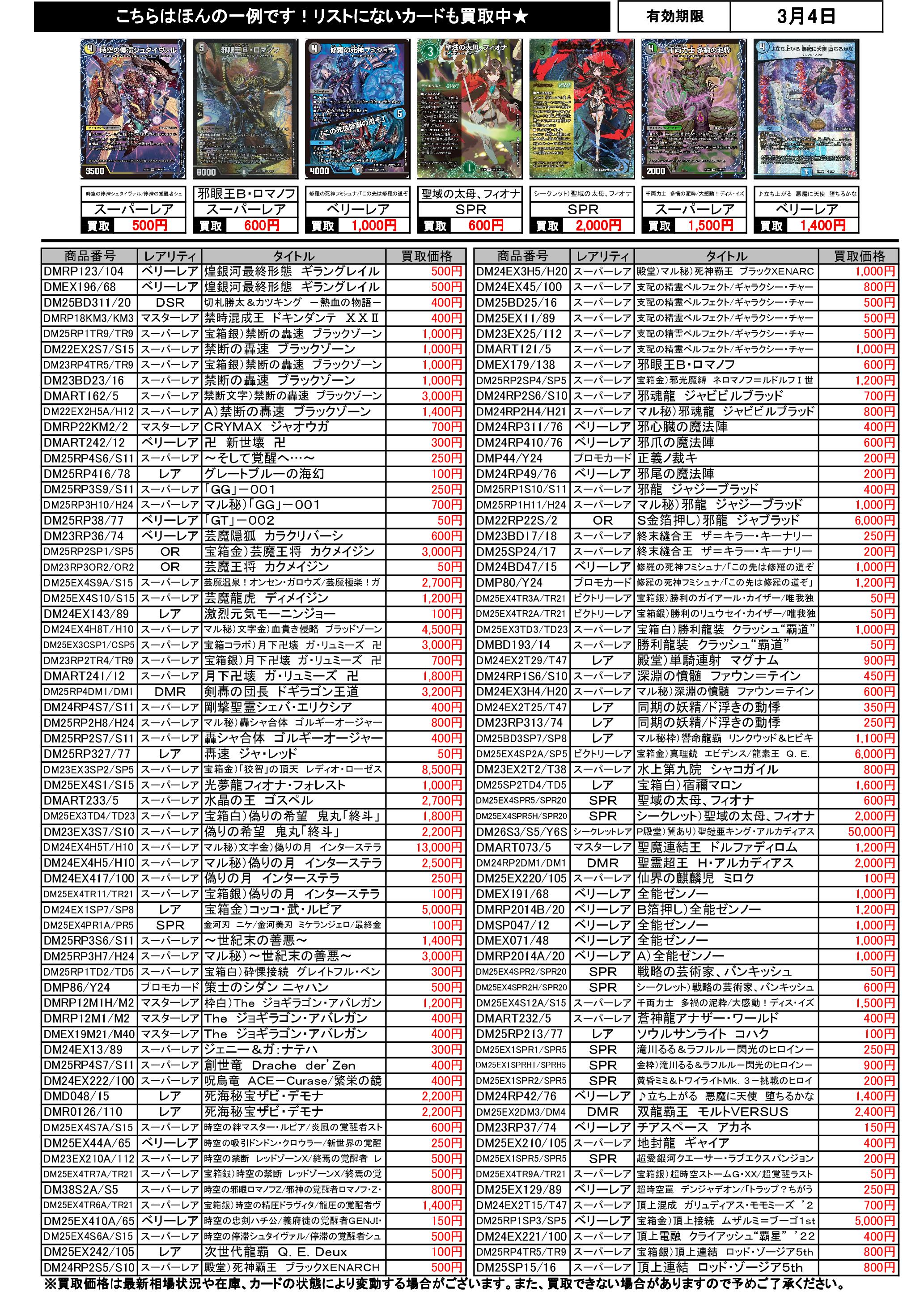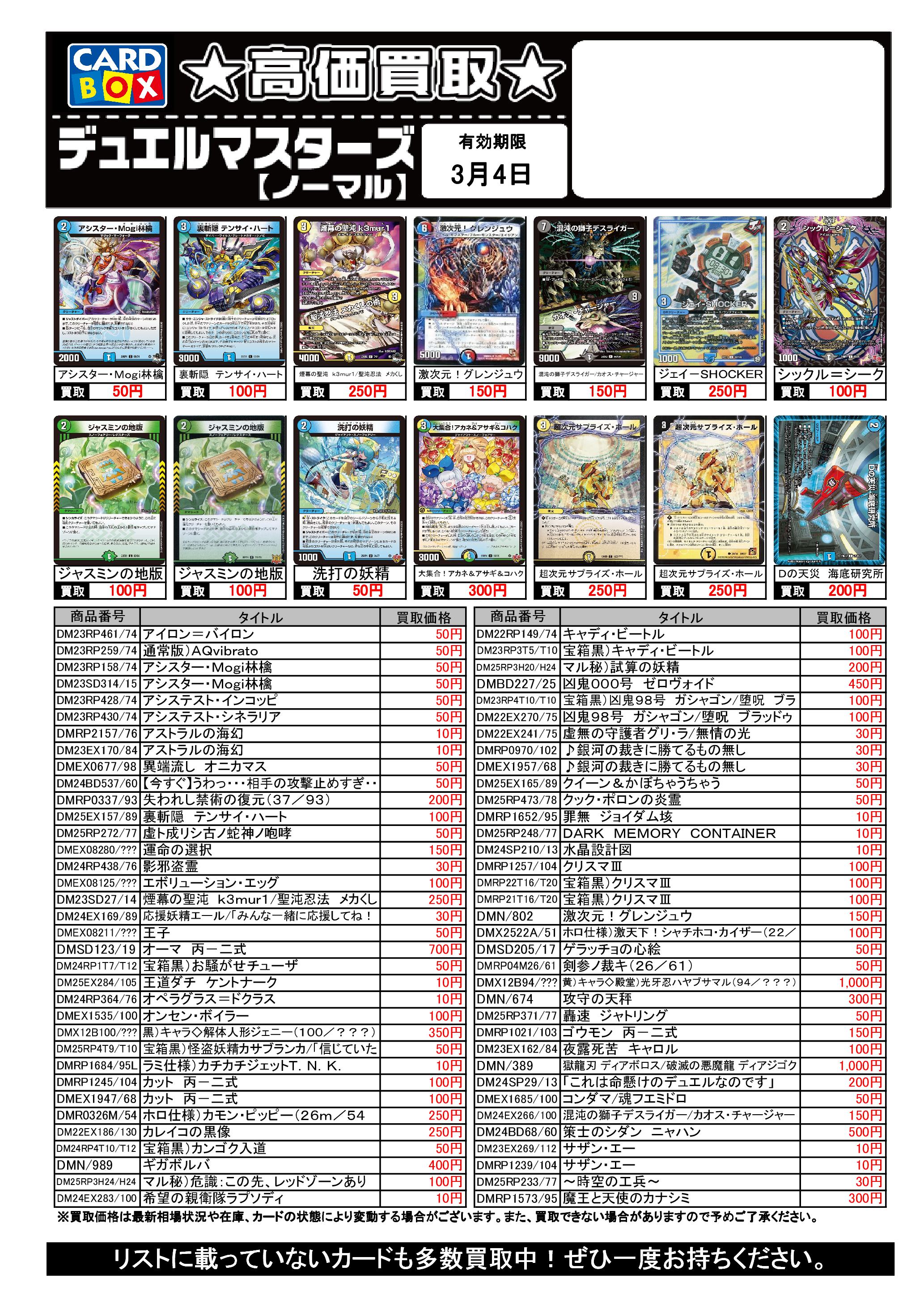 3/1~3/4のデュエマ買取表です
