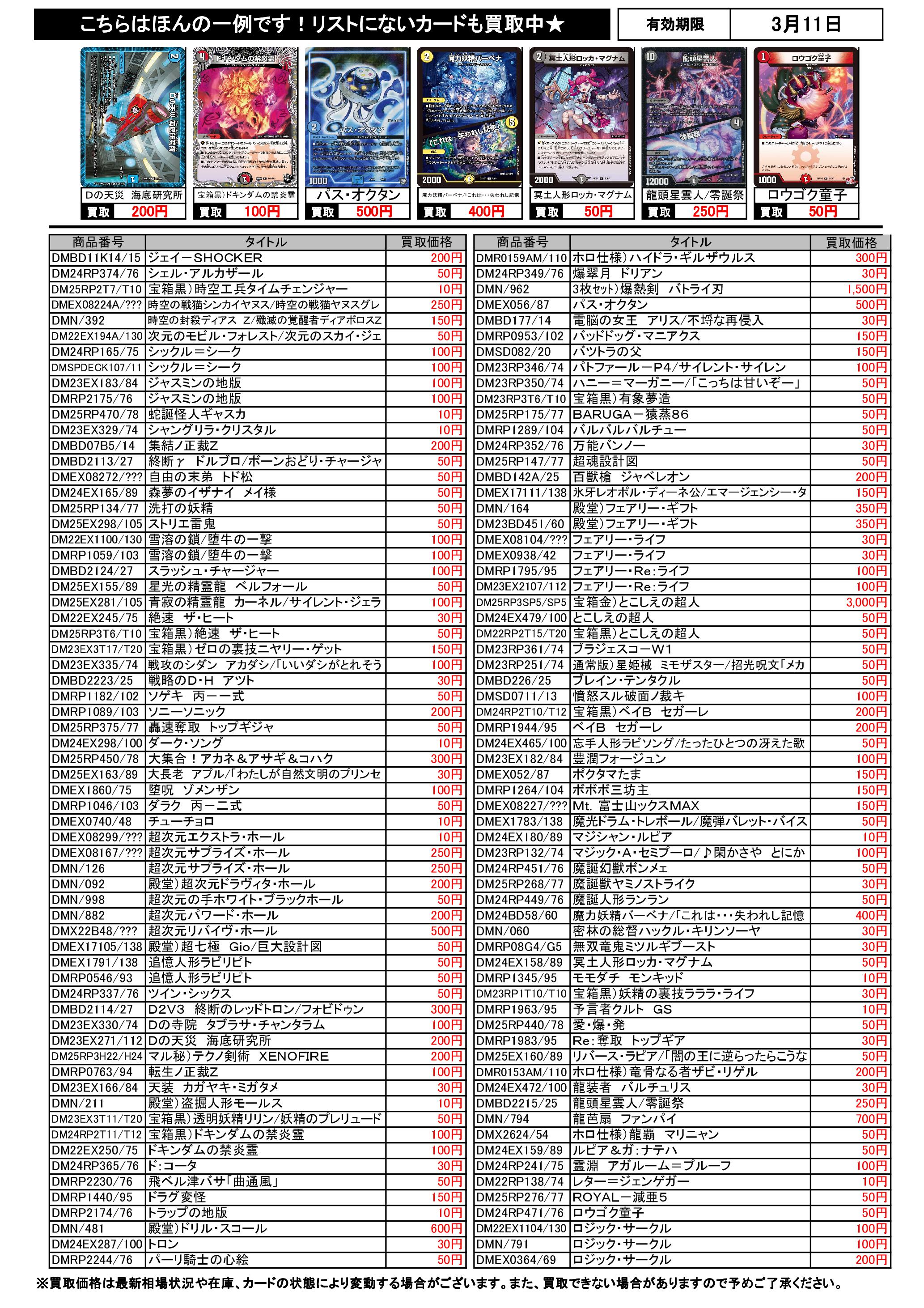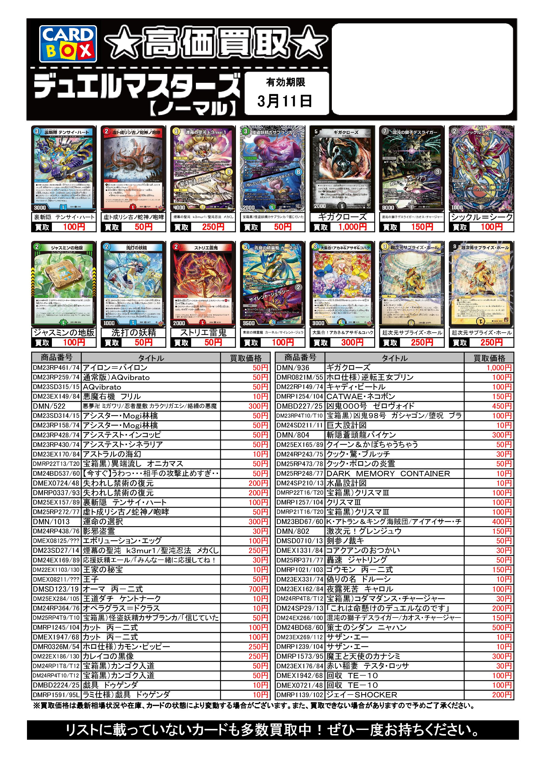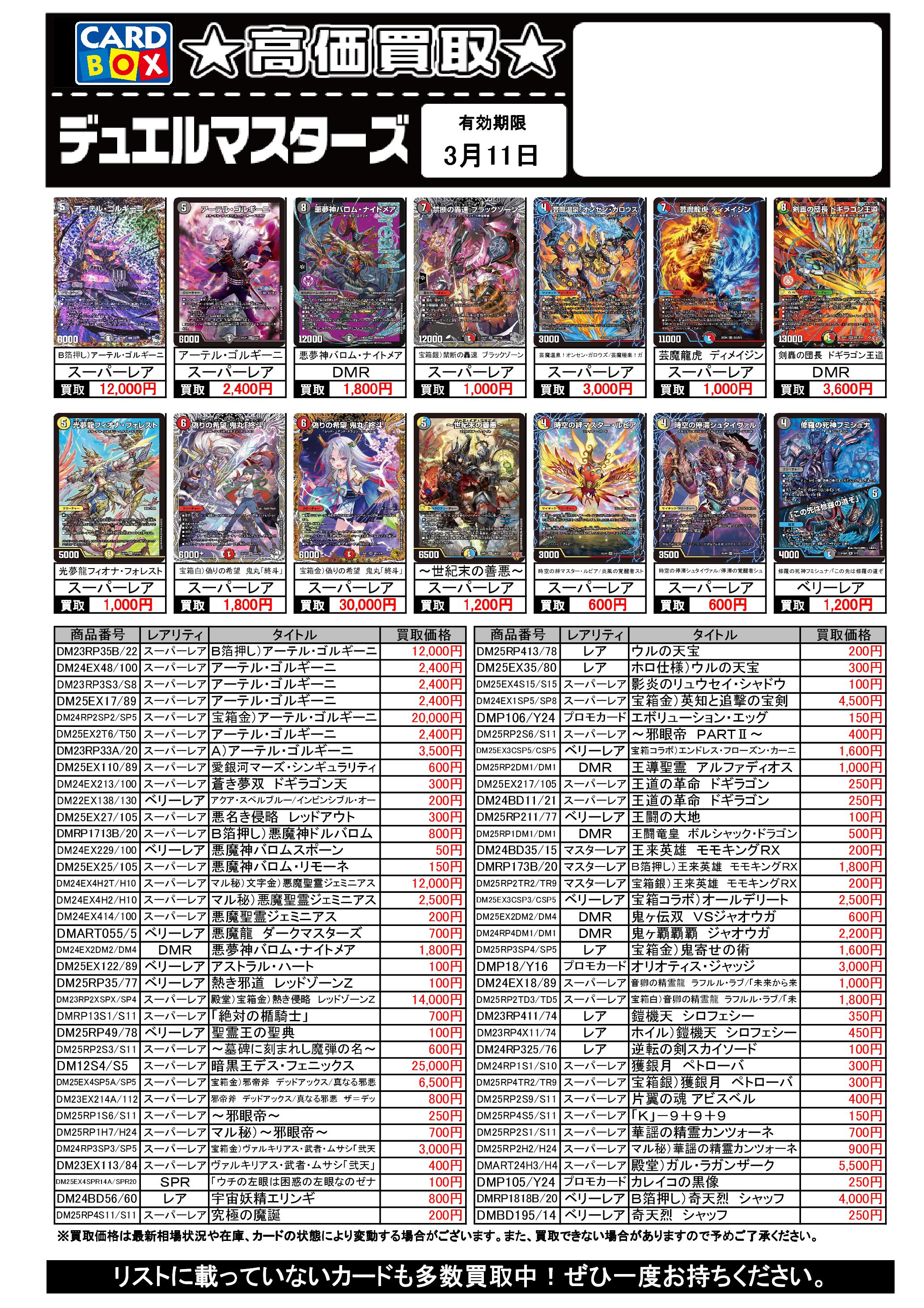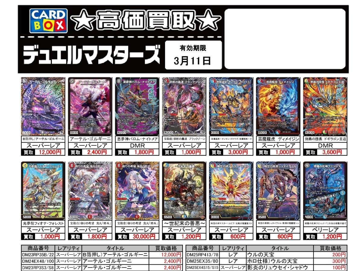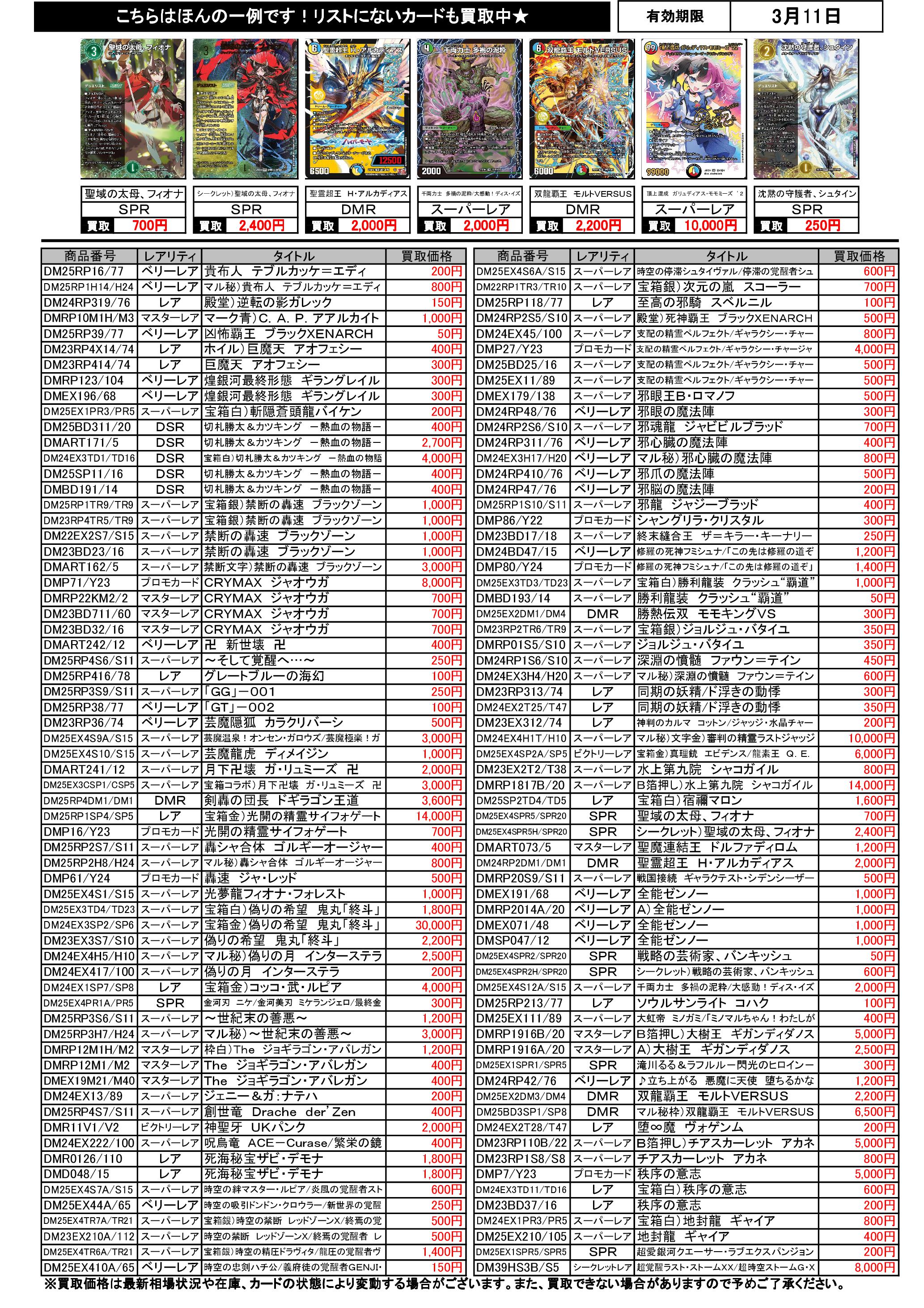 ※こちらの買取表は買取価格を保証するものではありません。カードの在庫枚数や状態によって価格が変動する場合がございます。また、表に掲載30,000円を超えるカードにつきまして買取しておりません。