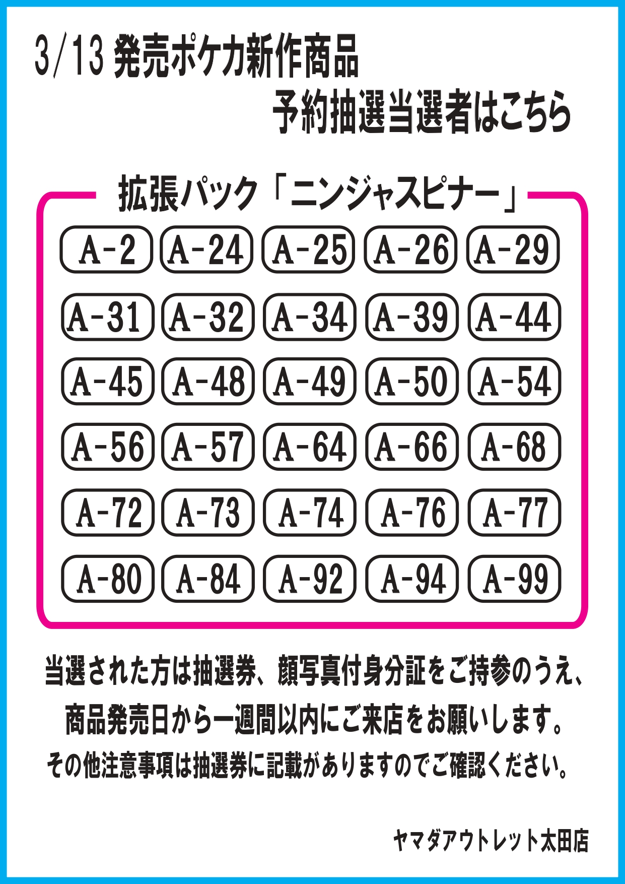 先日店頭にて行いました3/13発売のポケモンカードゲーム新品商品の予約抽選について、予約当選者は以下の通りです。
