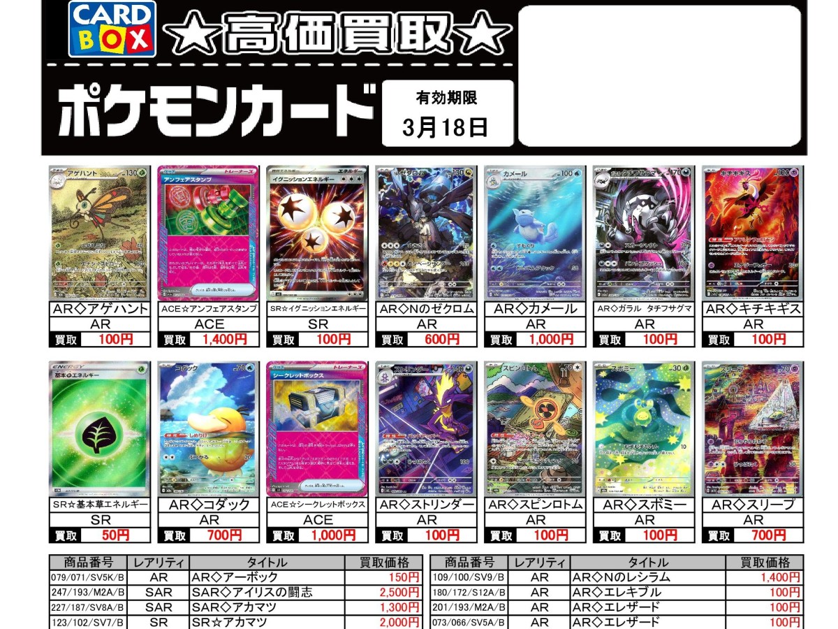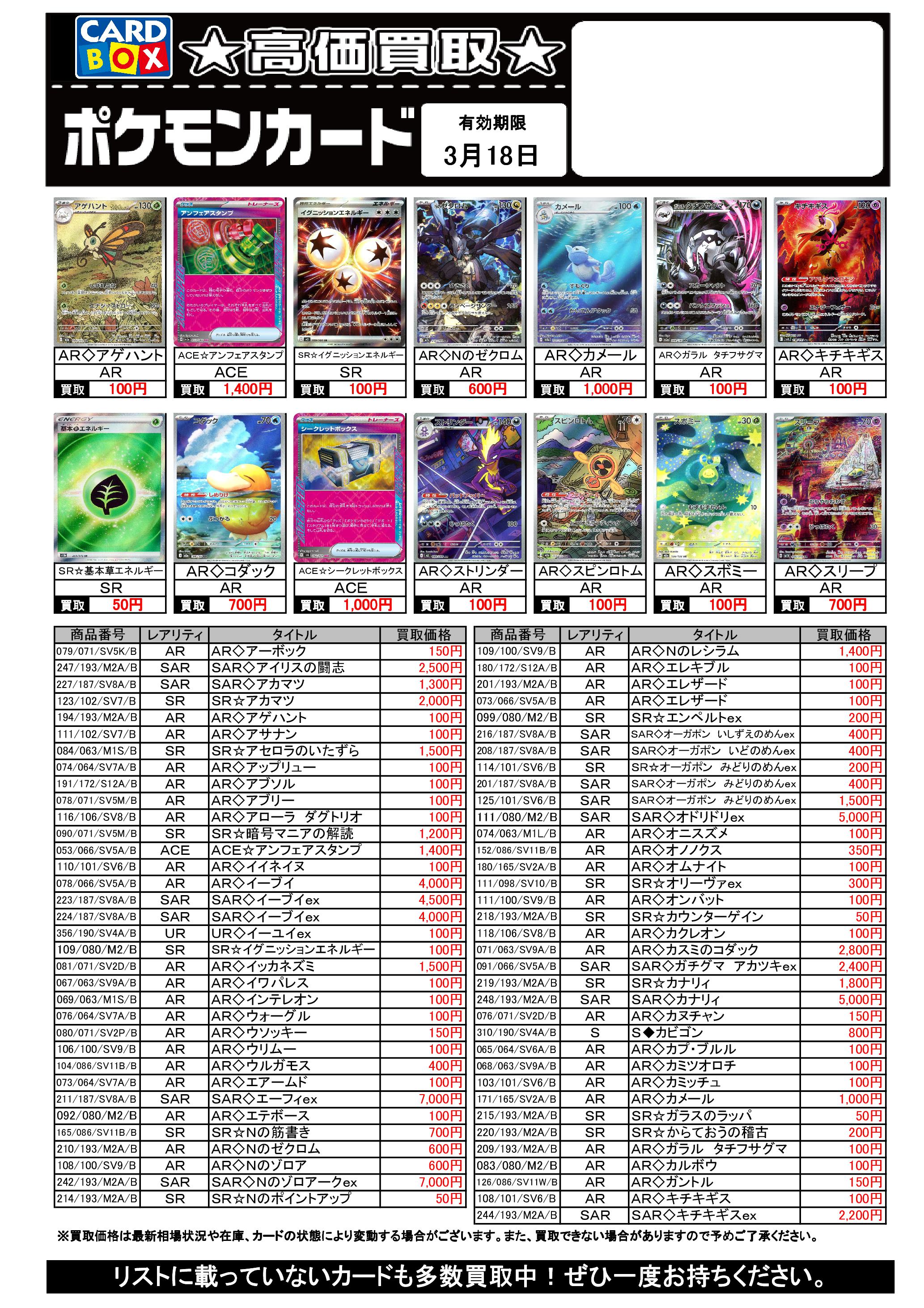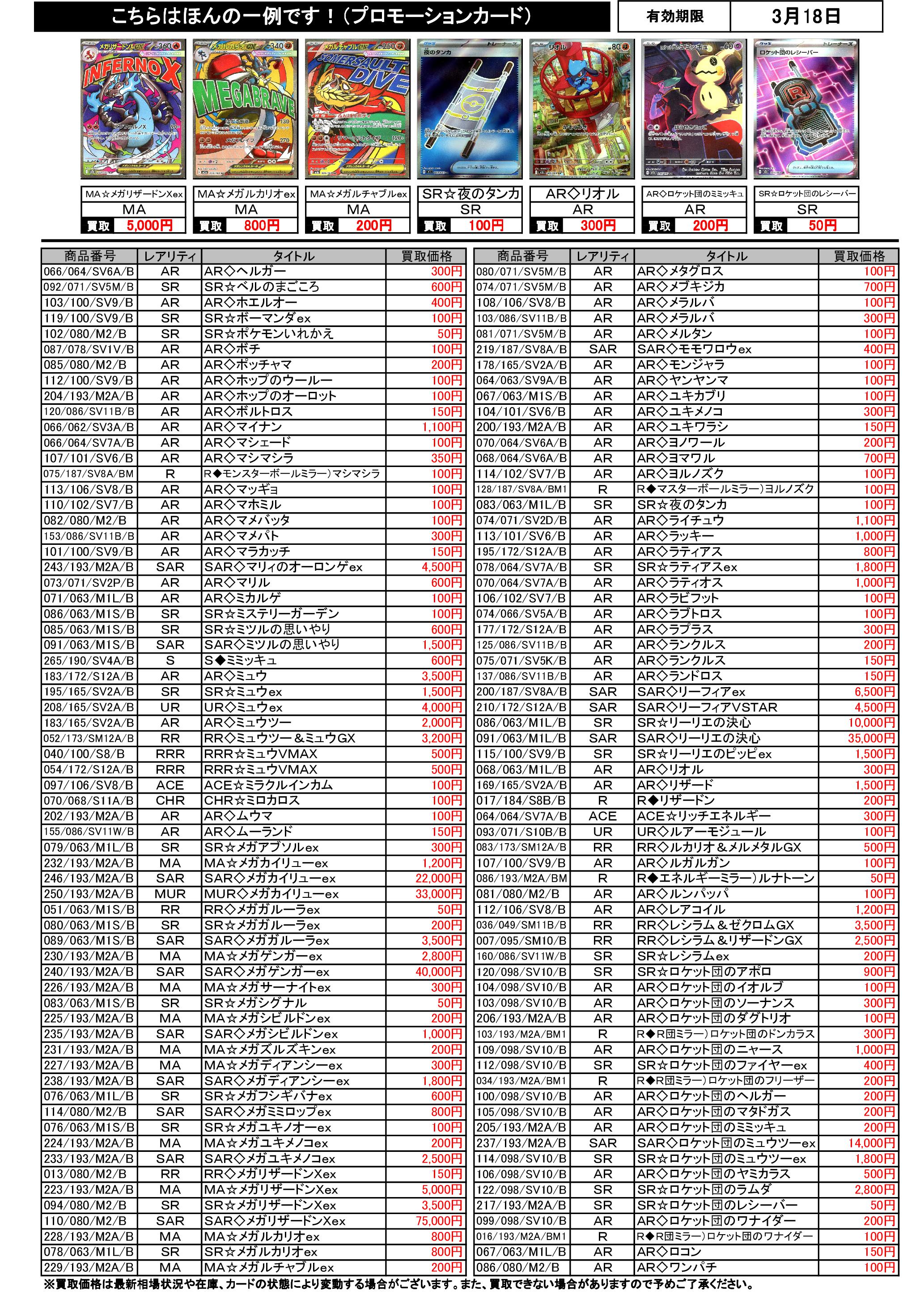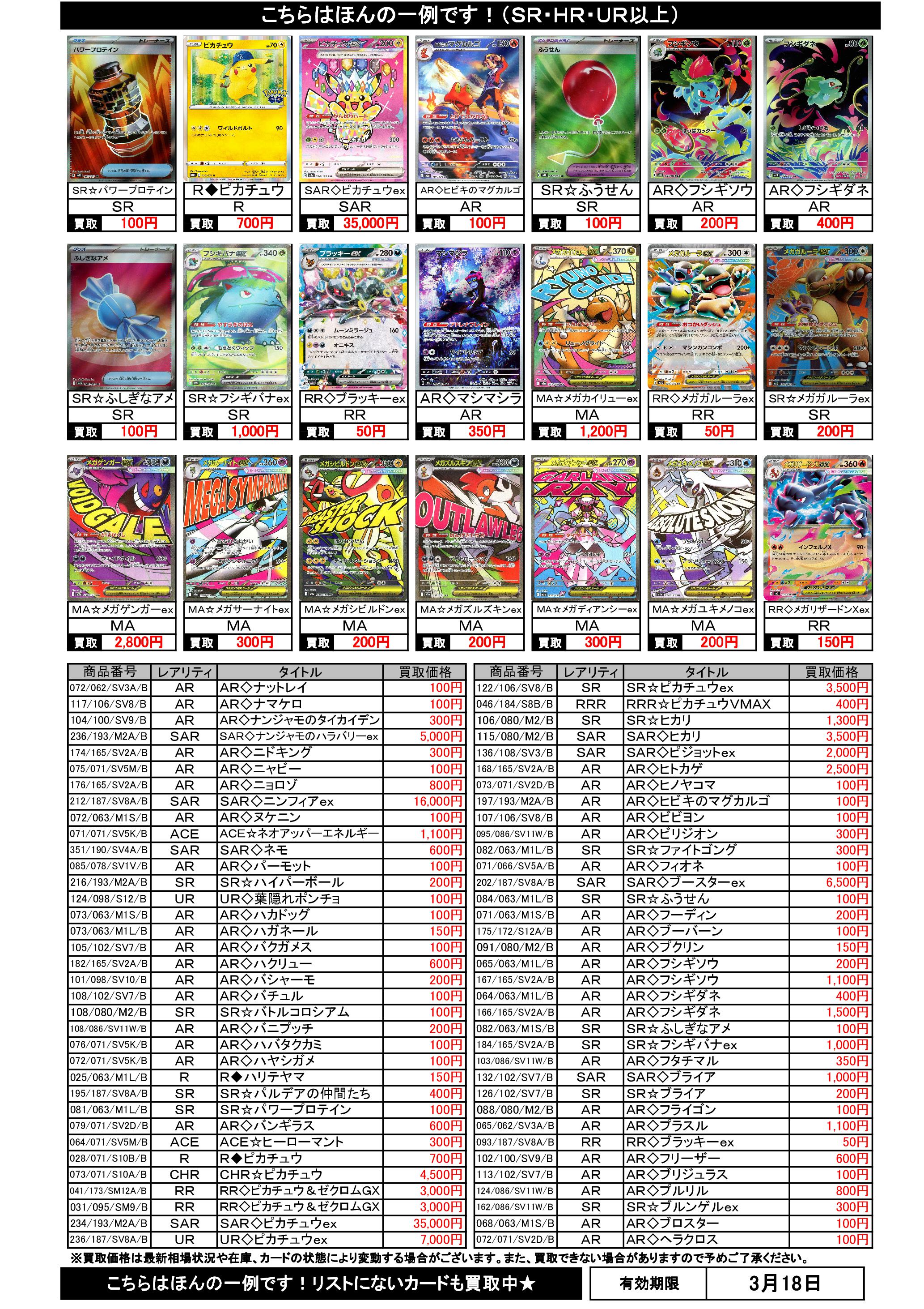 3/12~3/18のポケカ買取表です。
