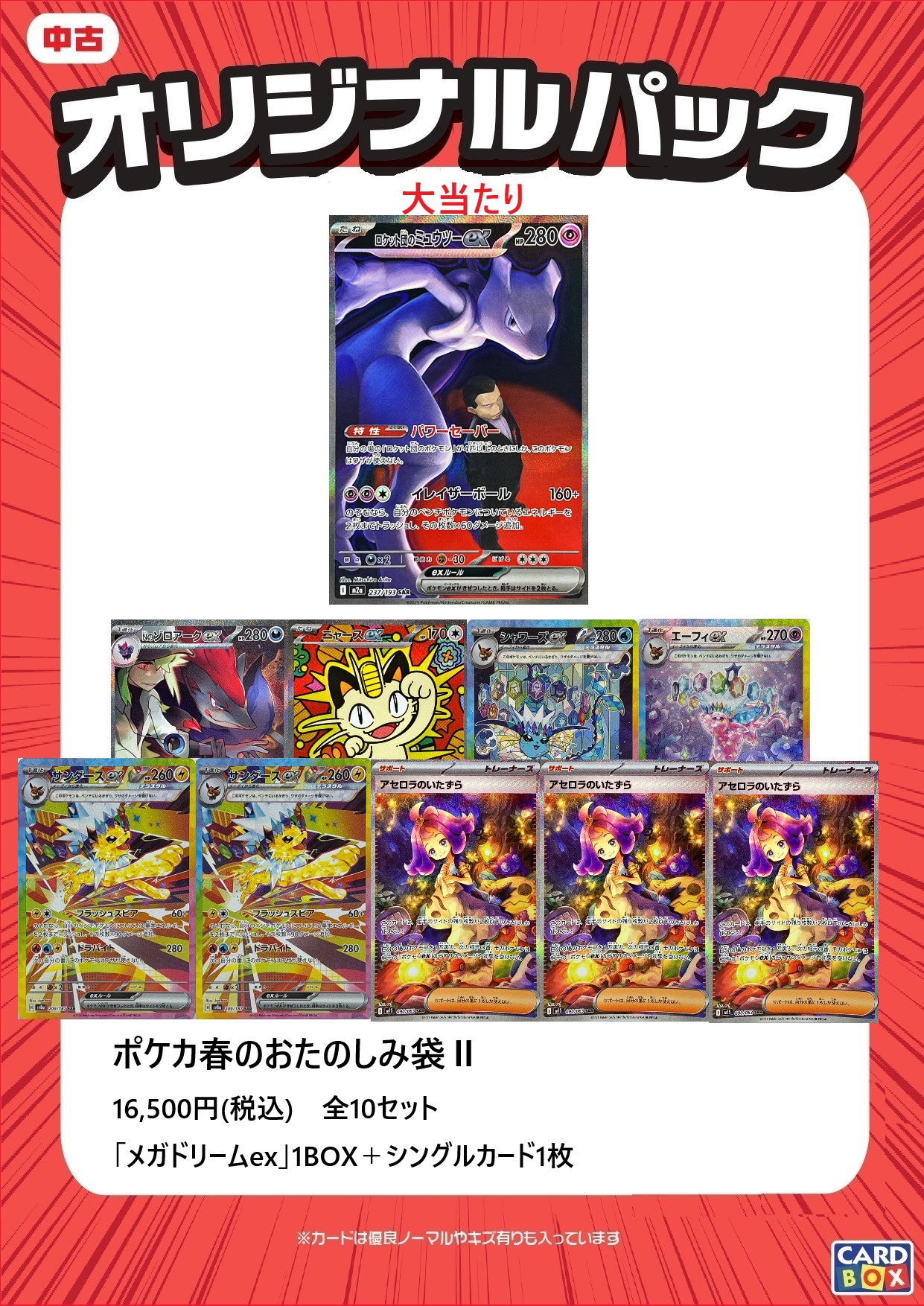今回はメガドリームexが1BOXと画像のシングルカードいずれか1枚が入って、税込価格16,500円となります。