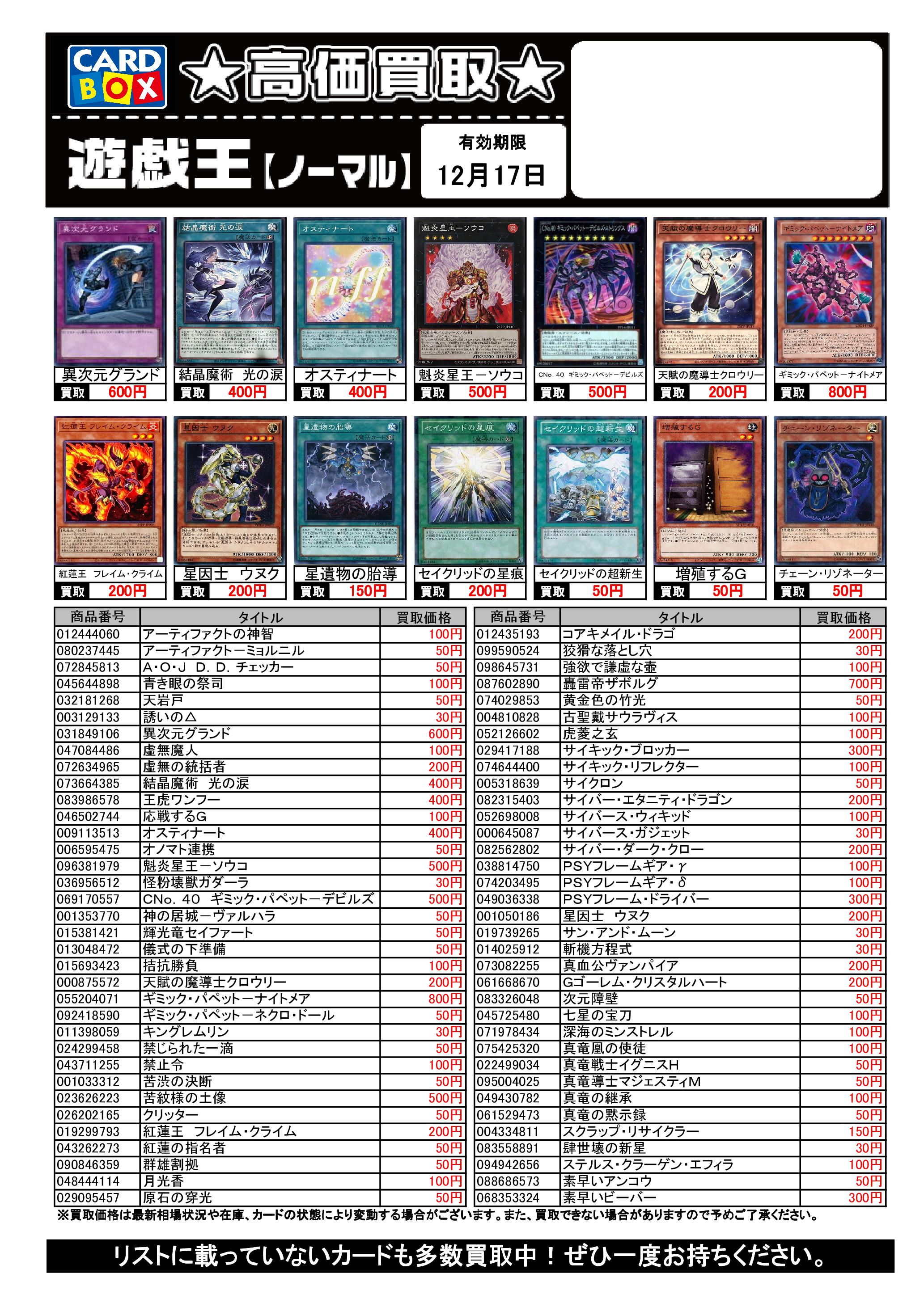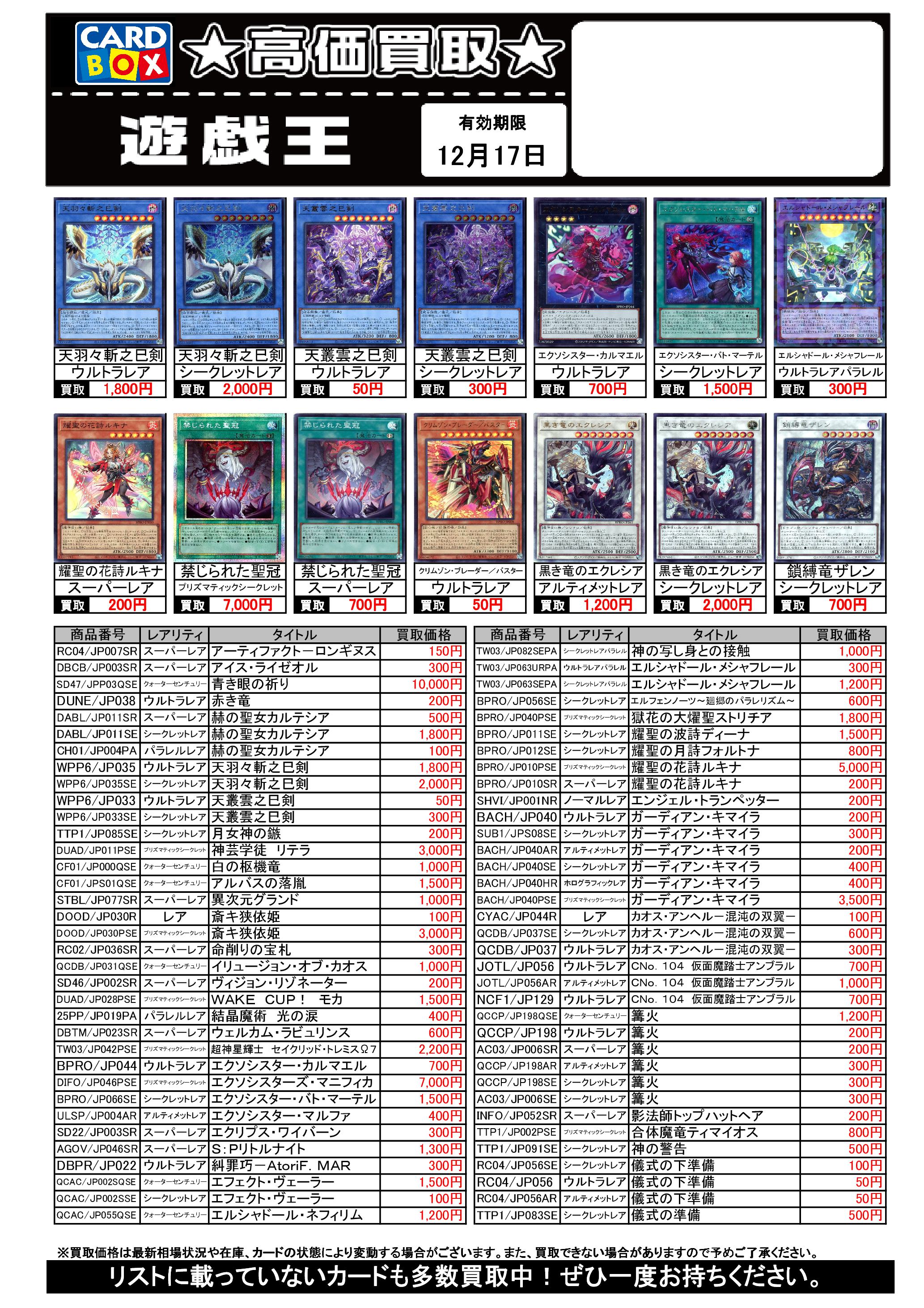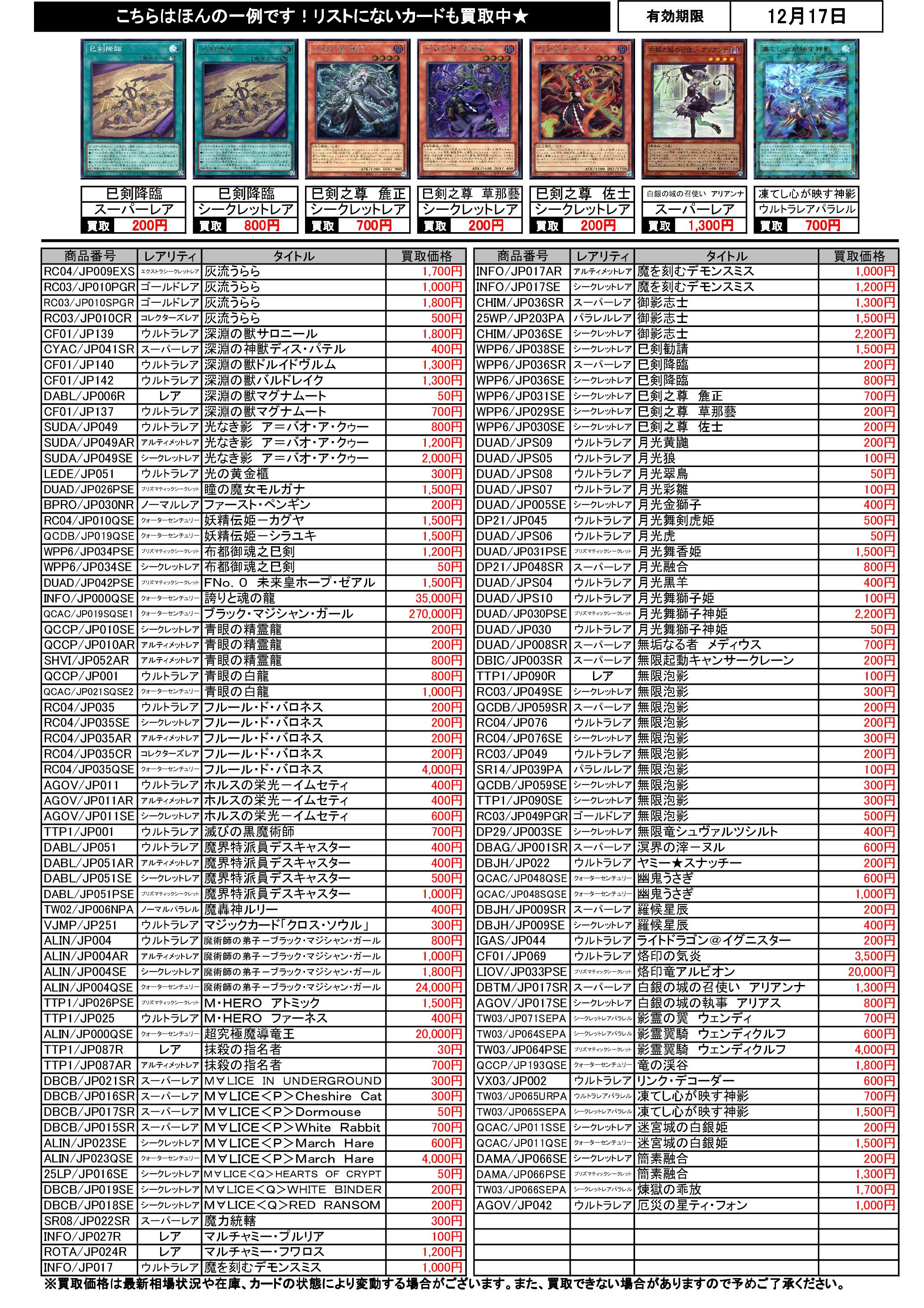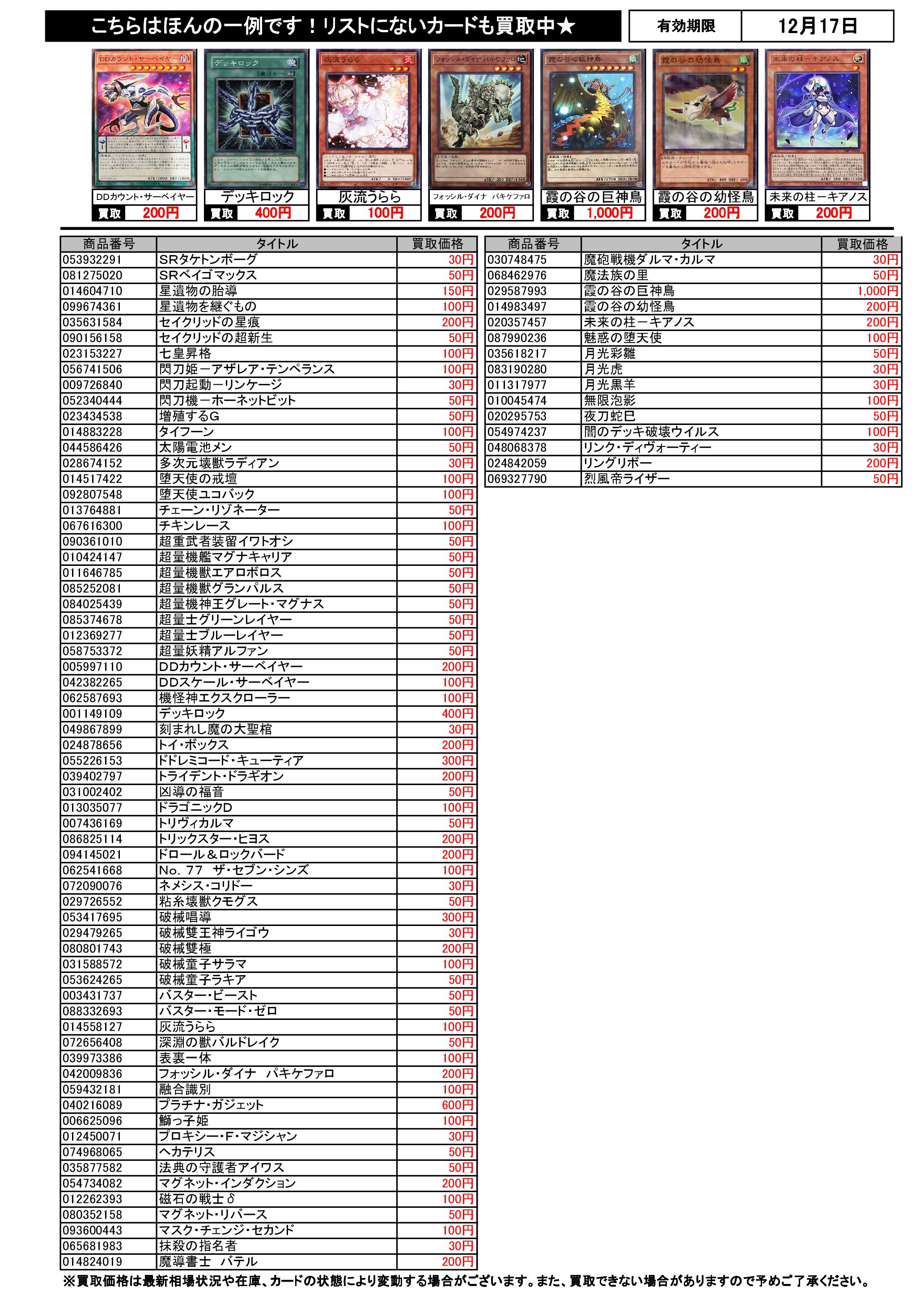 遊戯王買取リスト 12/17まで