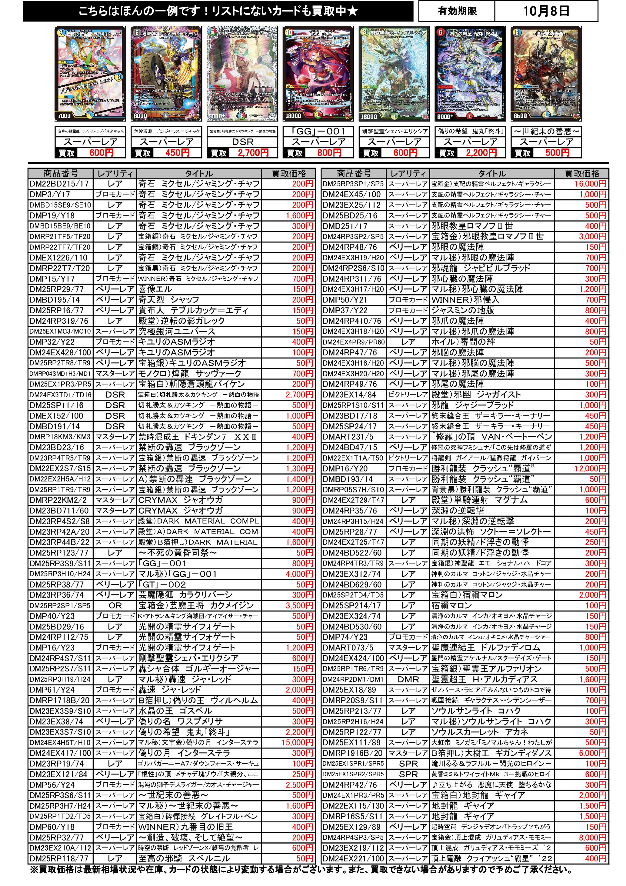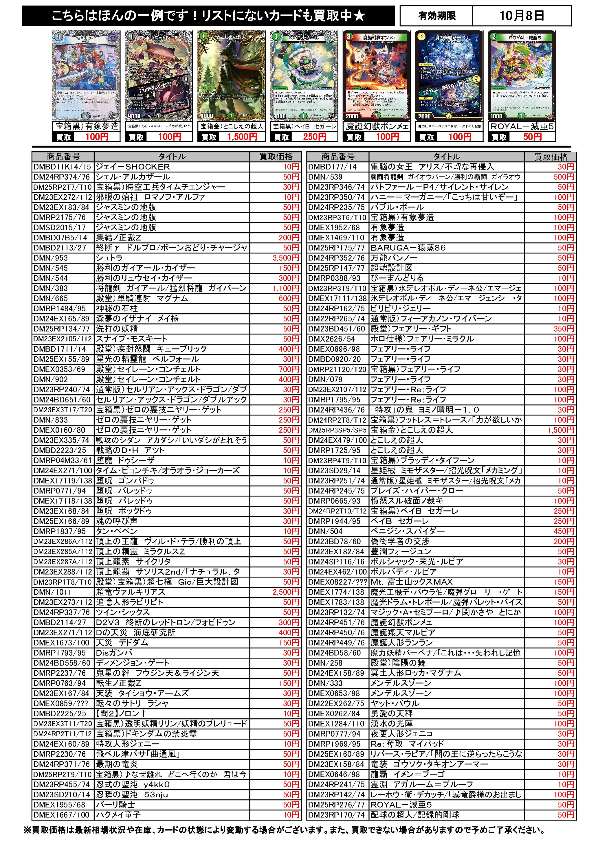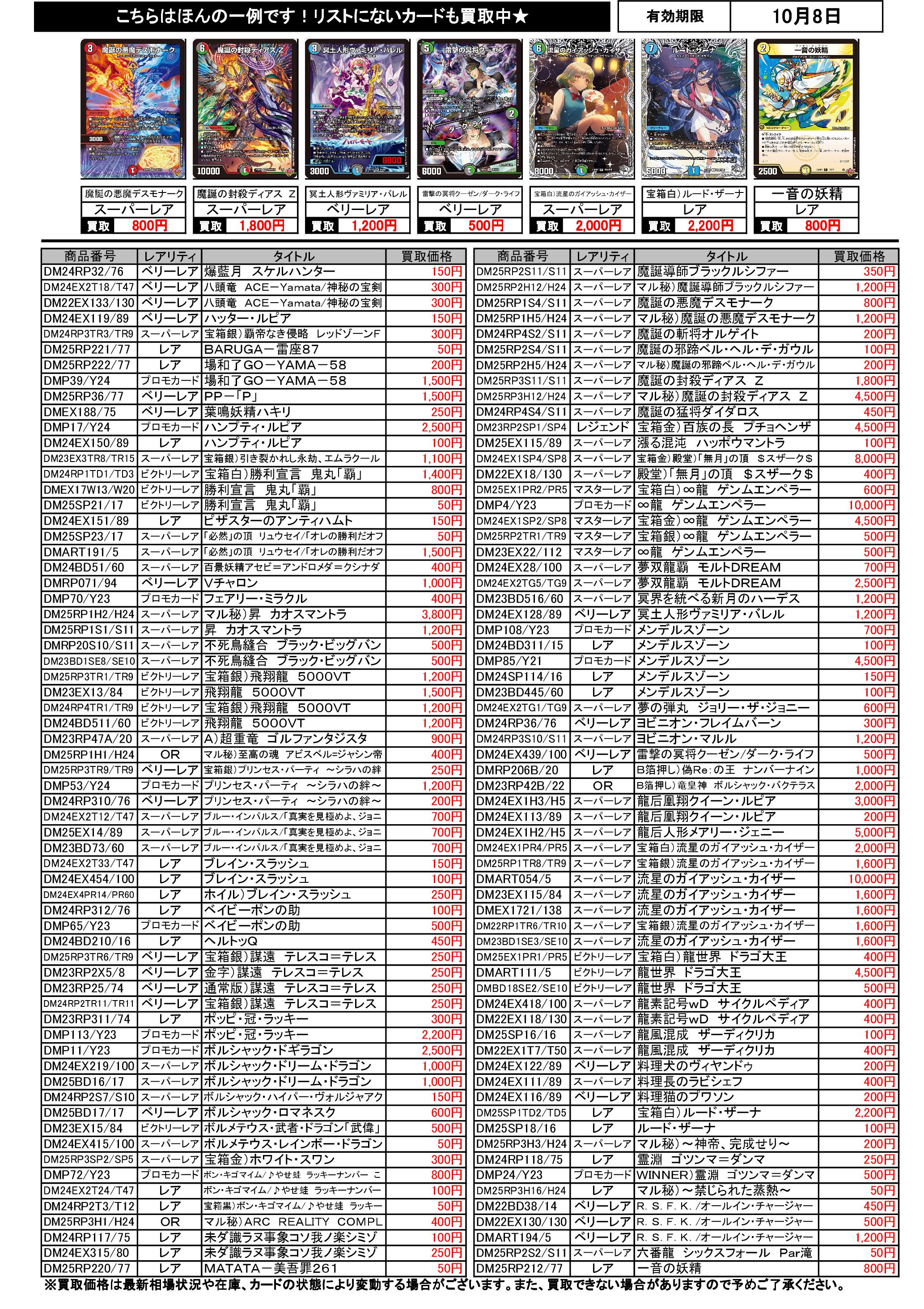 10/2~10/8のデュエマ買取表です