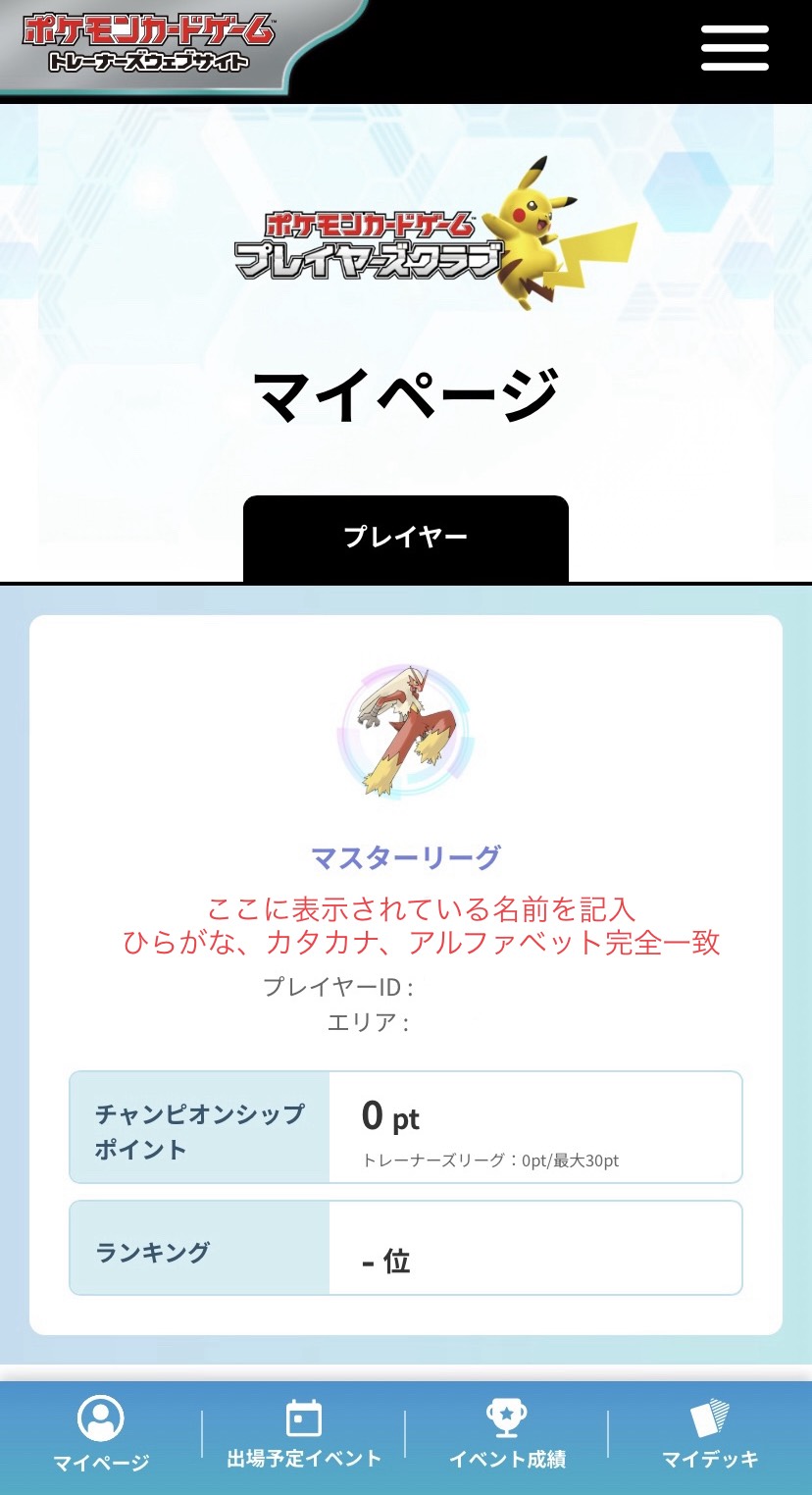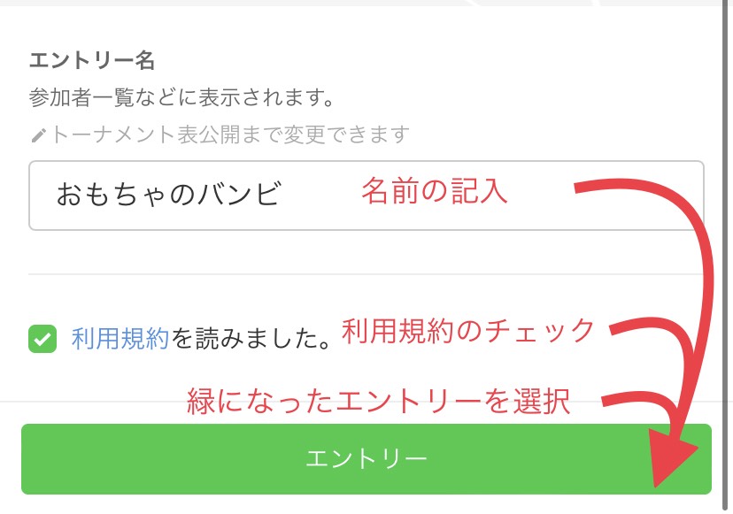 エントリー時はプレイヤークラブに表示されている名前を入力(ひらがな、カタカナ、アルファベット、記号、完全一致で入力)