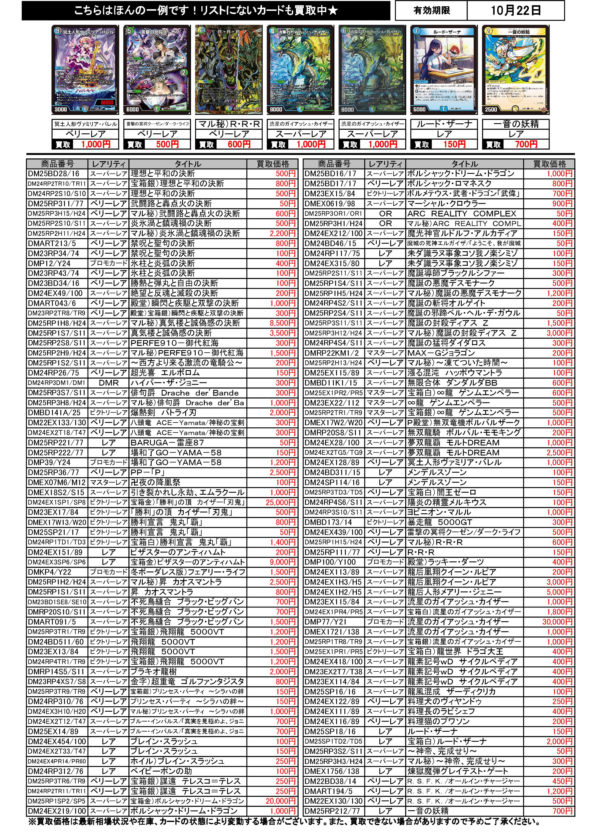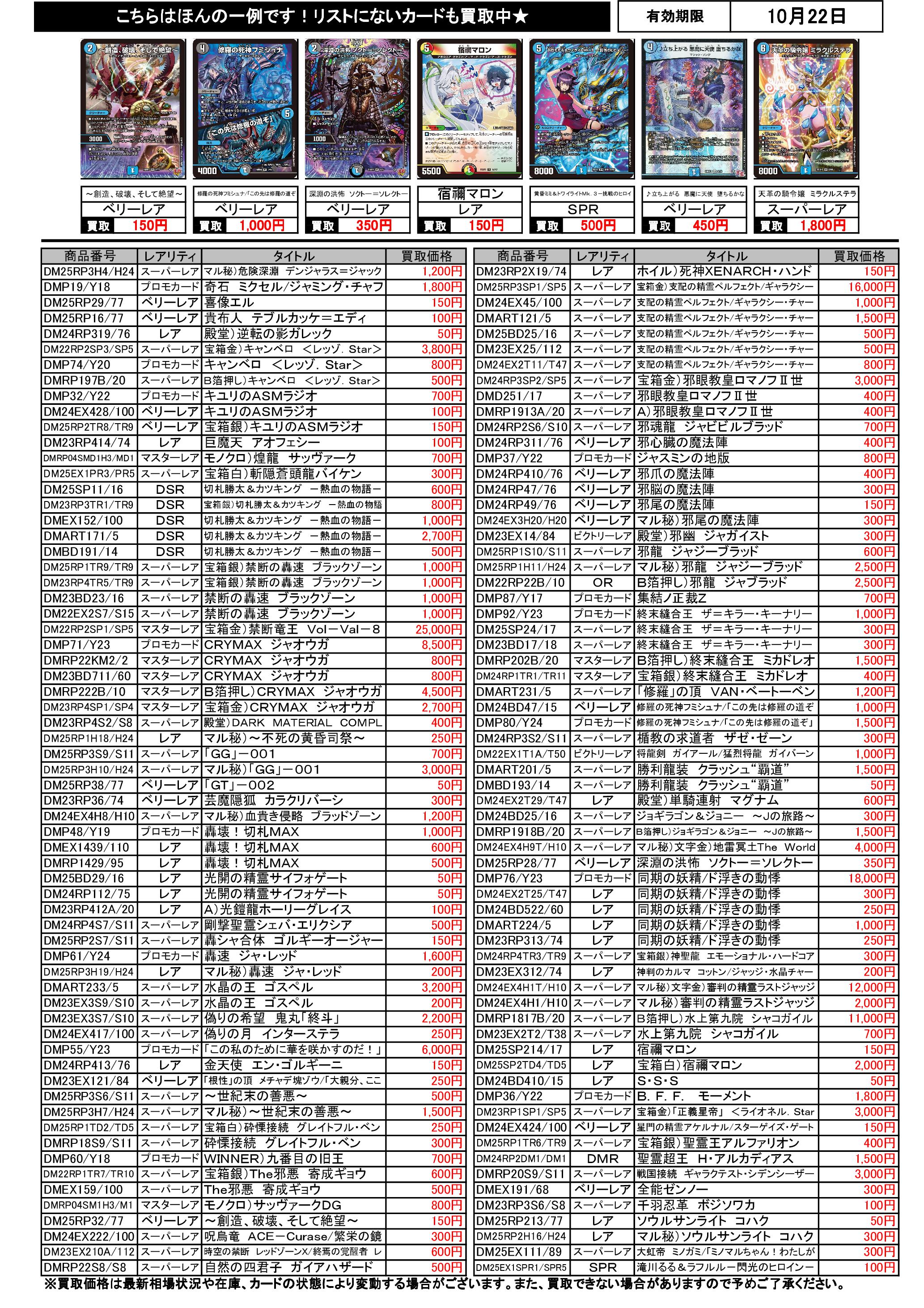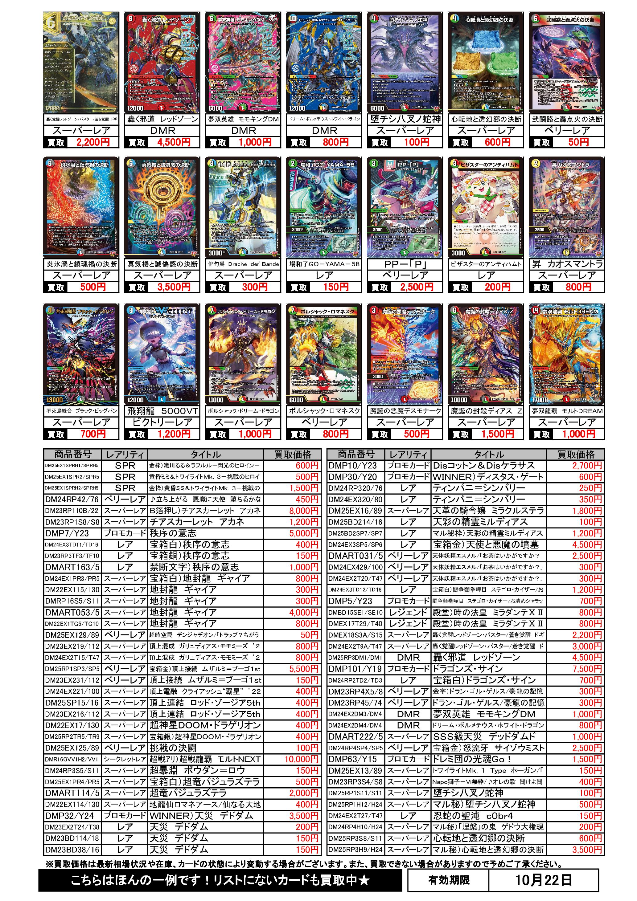 ※こちらの表は買取価格を保証するものではありません。カードの状態や在庫枚数によって価格が変動する場合がございます。また、表の30,000円を超えるカードにつきましては買取しておりません。
