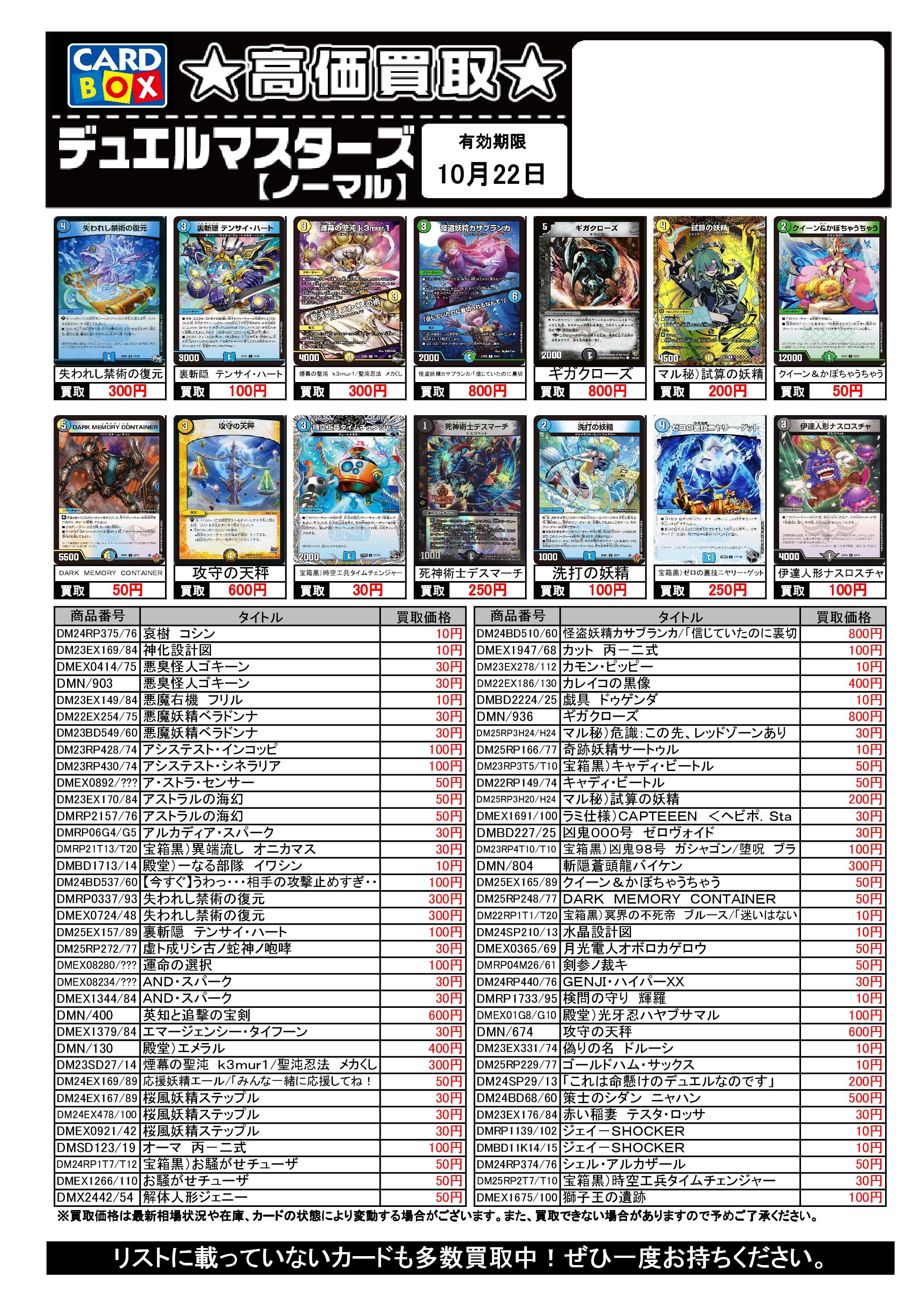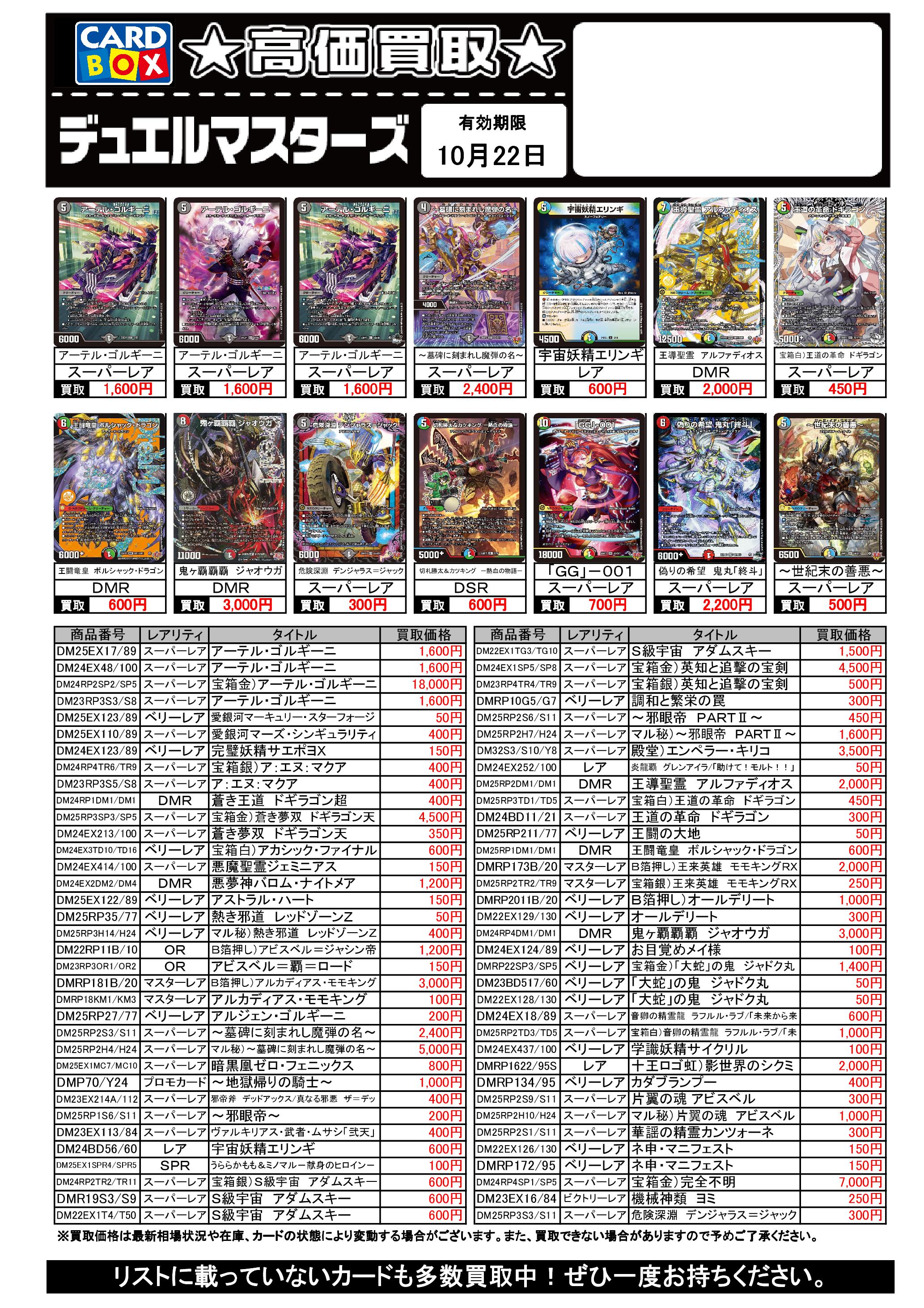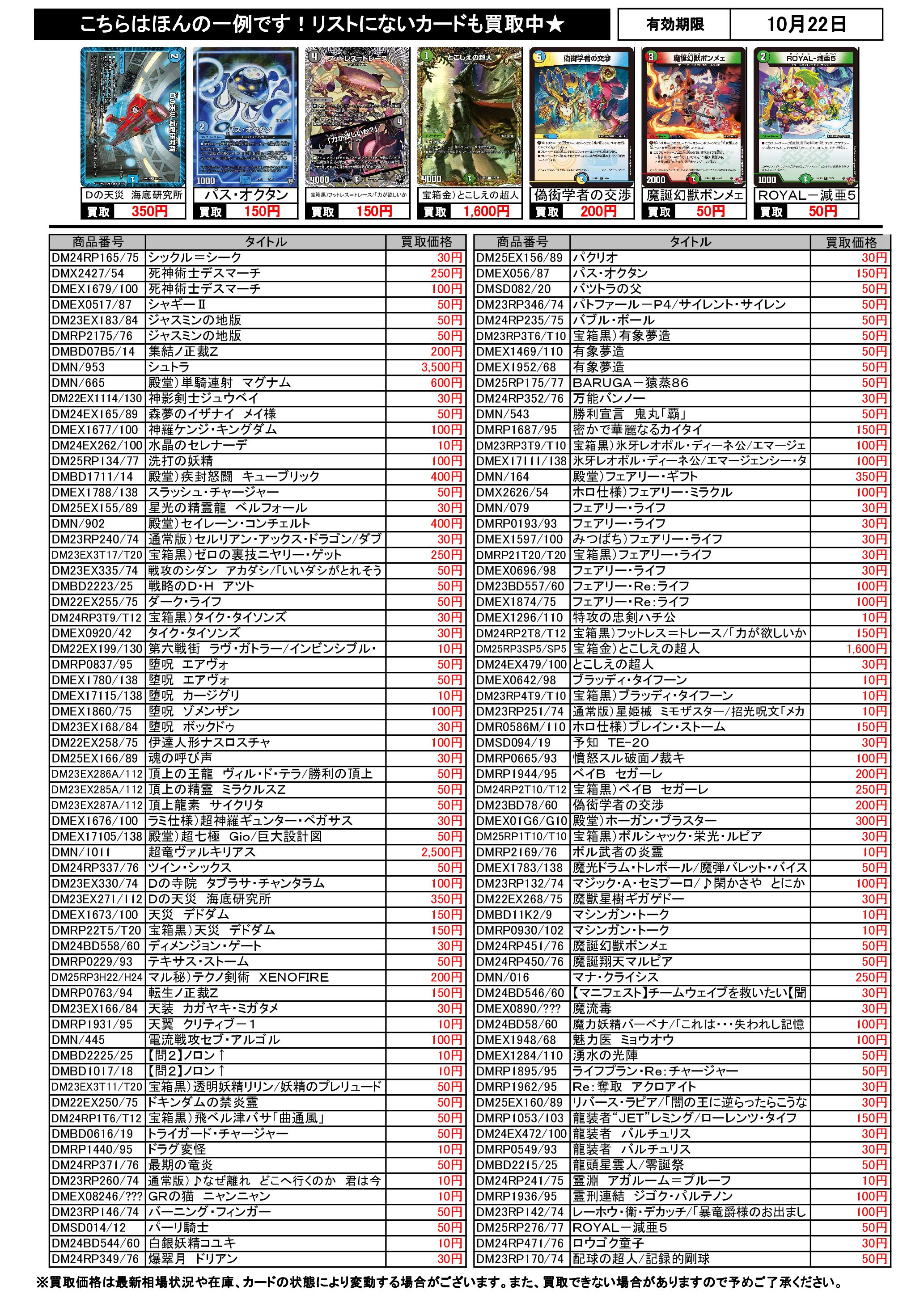 ※こちらの表は買取価格を保証するものではありません。カードの状態や在庫枚数によって価格が変動する場合がございます。また、表の30,000円を超えるカードにつきましては買取しておりません。